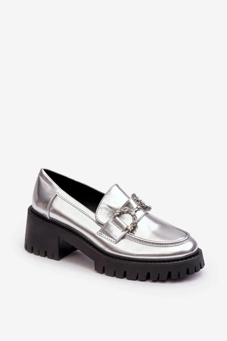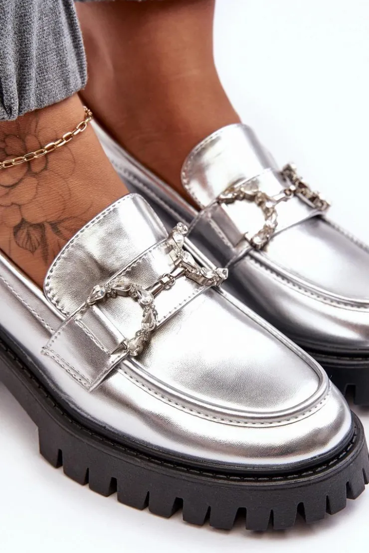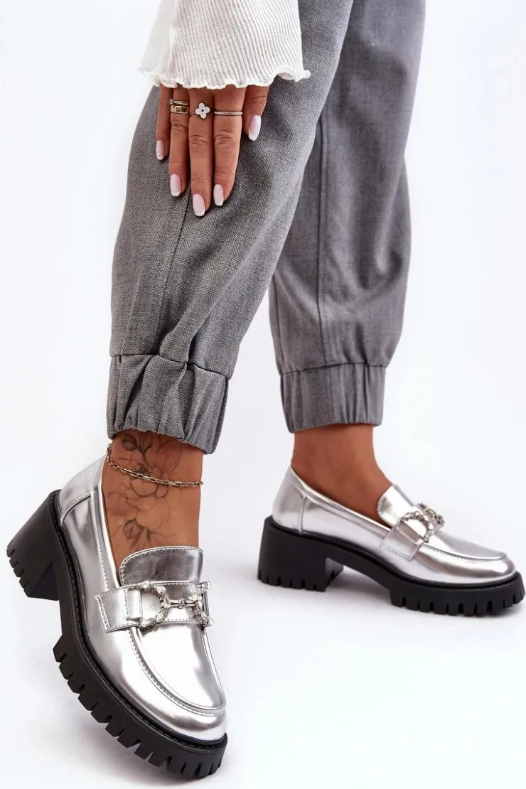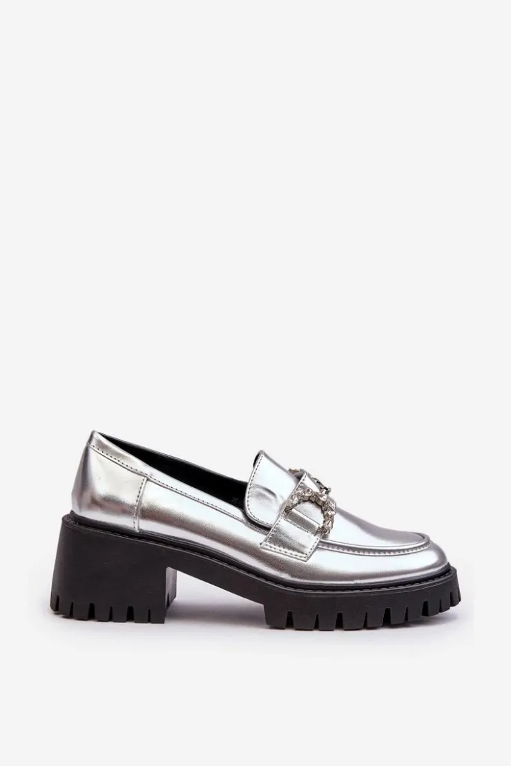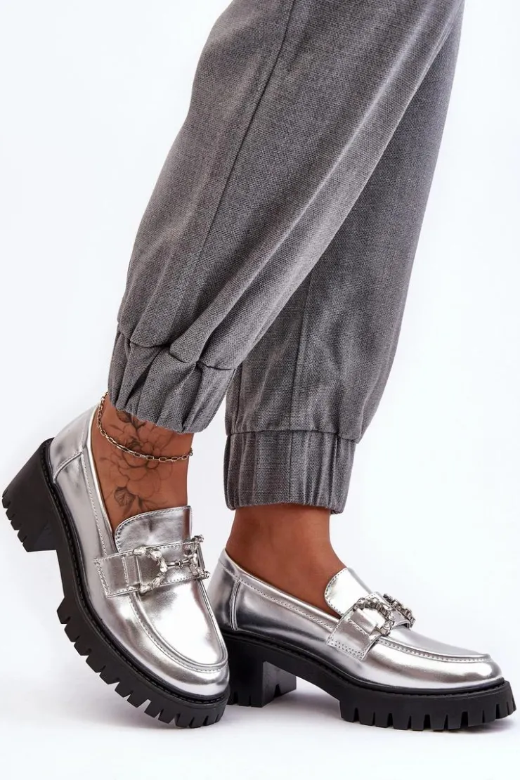 Półbuty damskie wykonane z eko skóry. Osadzone na masywnym, niskim obcasie i platformie. Z przodu na pasku biżuteryjna ozdoba. Noski zaokrąglone. Usztywniony zapiętek. Z tym modelem stworzysz wiele świetnych jesiennych stylizacji! Przy wyborze rozmiaru prosimy sugerować się tabelą rozmiarów.