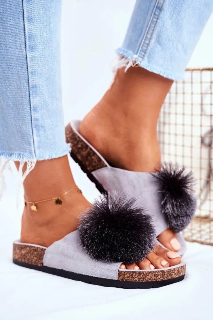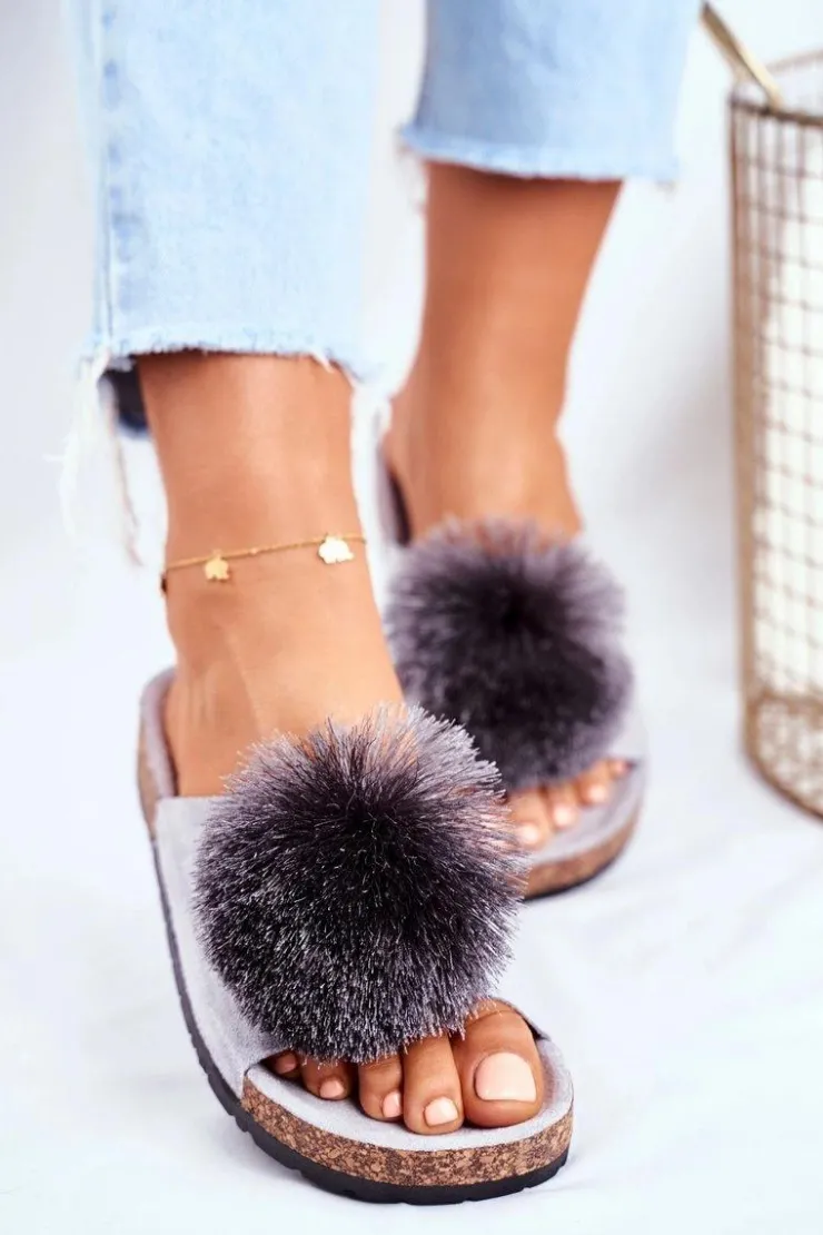 Discount Boto Damskie Szare Klapki Na Korku z Pomponem Galaxo