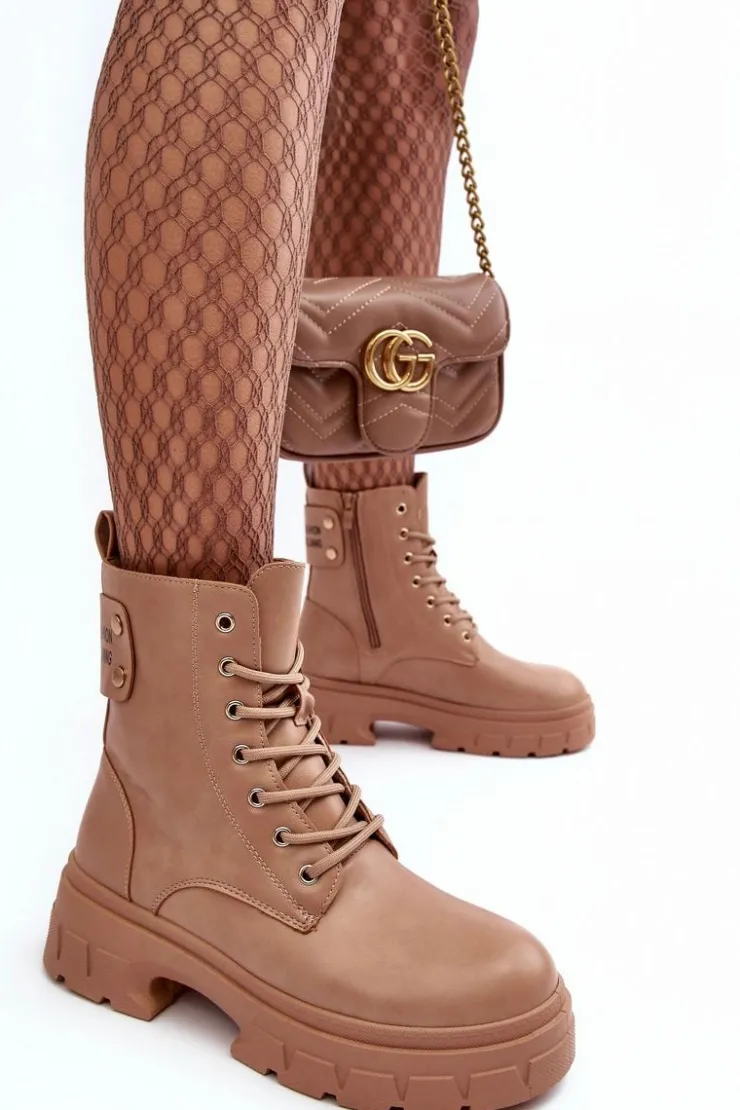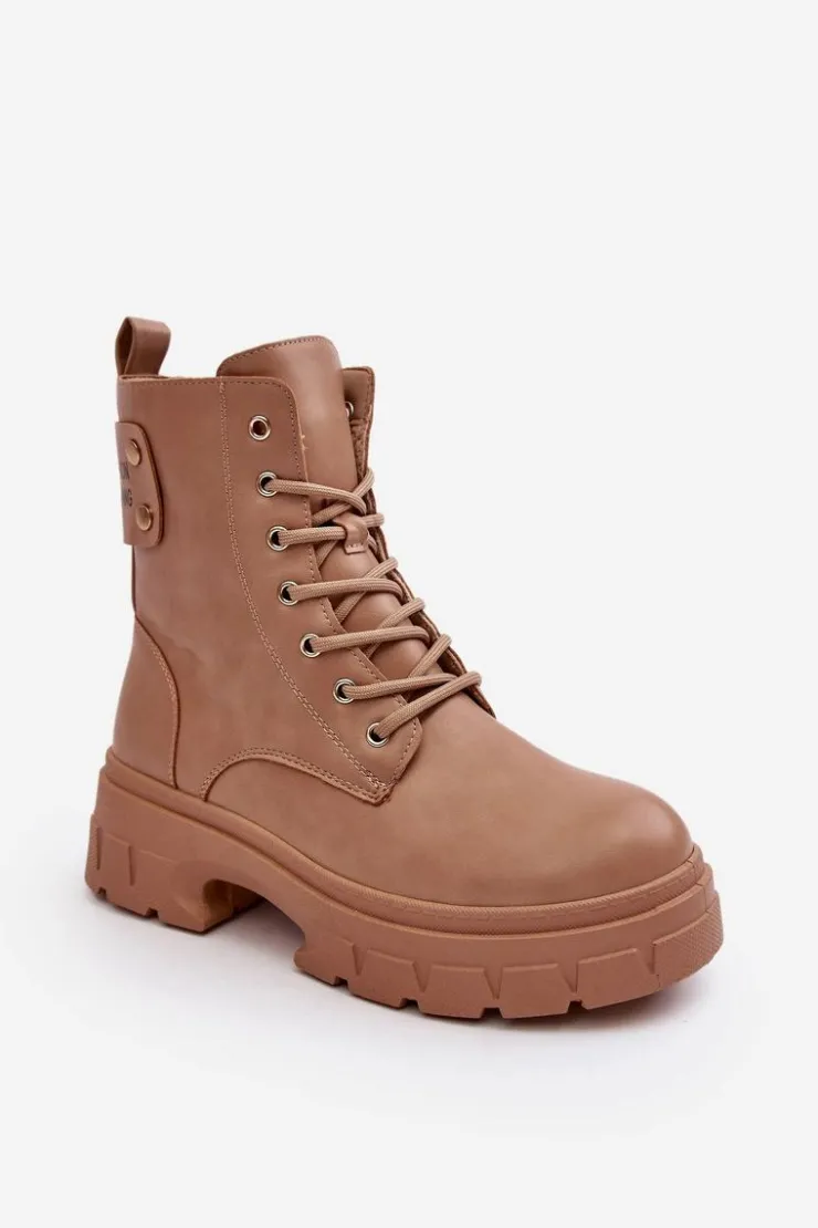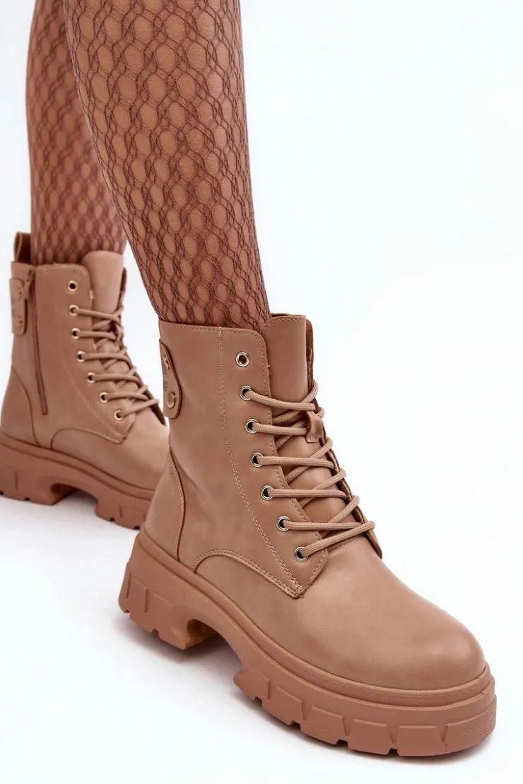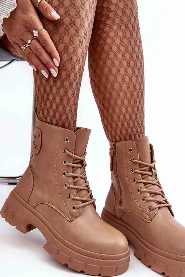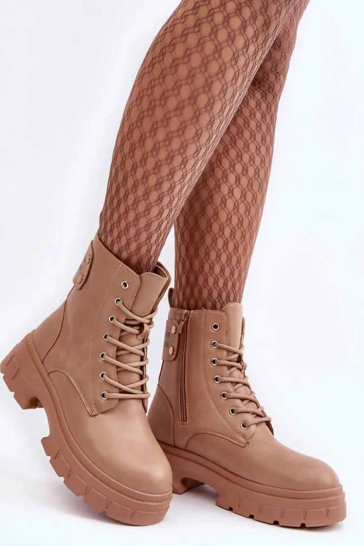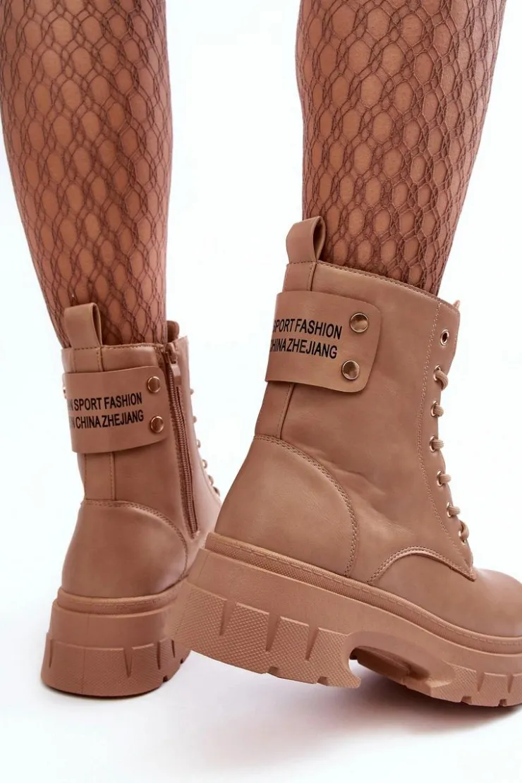 Botki damskie osadzone na płaskim obcasie i platformie. Wykonane z eko skóry. Sznurowanie z przodu oraz dodatkowe zapięcie na suwak. Ocieplone kocem obuwniczym. Z tyłu na cholewce gruby pasek z napisem. Świetny model do jesiennych i zimowych stylizacji! Przy wyborze rozmiaru prosimy sugerować się tabelą rozmiarów.