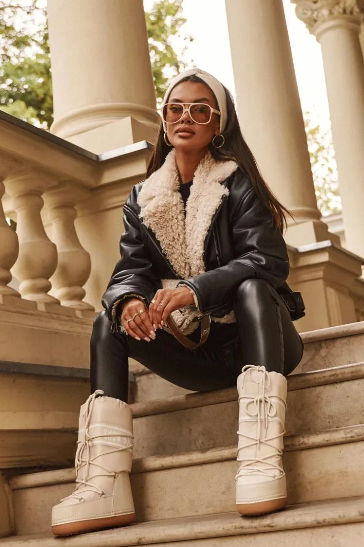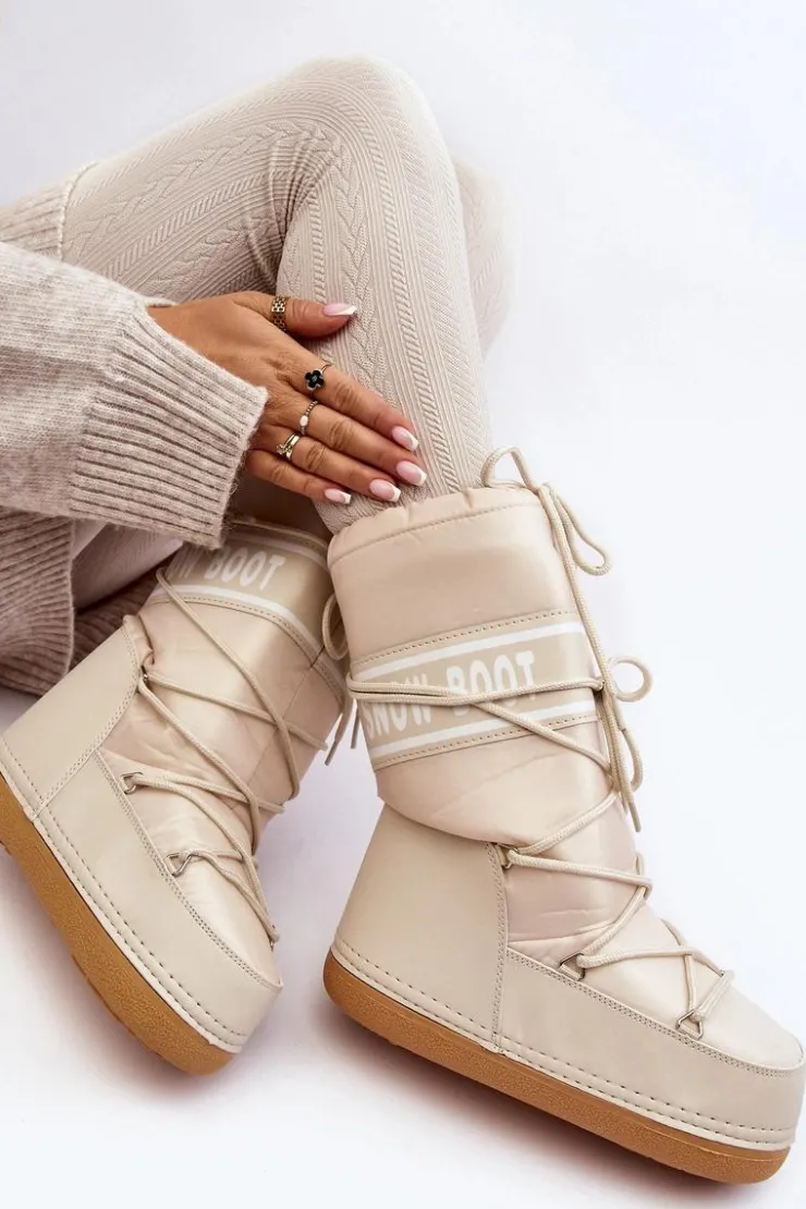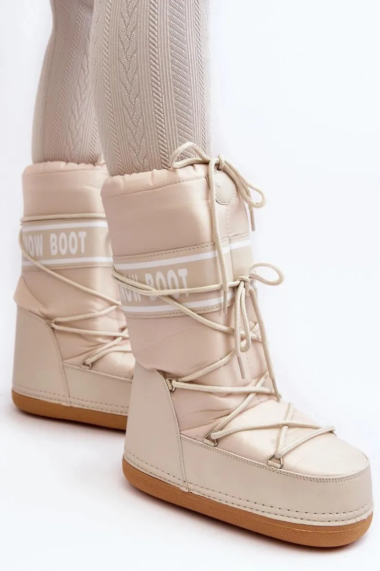 Niezwykle ciepłe i wygodne, damskie śniegowce zostały wykonane z materiałów odpornych na zimno i wiatr. Cholewka z dodatkiem eko skóry i ozdobnym napisem wzbogaci Twoją jesienno-zimową stylizację. Śniegowce są wsuwane i posiadają dodatkowe sznurowanie z przodu i u góry cholewki. Model ten został osadzony na masywnej platformie. Wewnątrz posiadają ocieplenie w postaci pianki i koca obuwniczego. Te śniegowce to idealny model na chłodniejsze dni! Przy wyborze rozmiaru prosimy sugerować się tabelą rozmiarów.