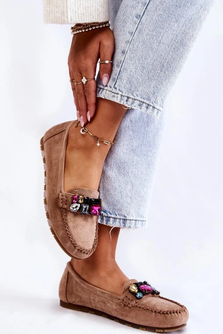 Damskie mokasyny zostały wykonane z miłego w dotyku eko zamszu. Na przodzie znajdują się ozdobne kamienie. Mokasyny zostały osadzone na delikatnej platformie, z antypoślizgową podeszwą. Zapiętek jest delikatnie usztywniany. Miękka wkładka jest dodatkowo perforowana i wykonana z naturalnej skóry. Świetny model do wielu stylizacji! Przy wyborze rozmiaru prosimy sugerować się tabelą rozmiarów.