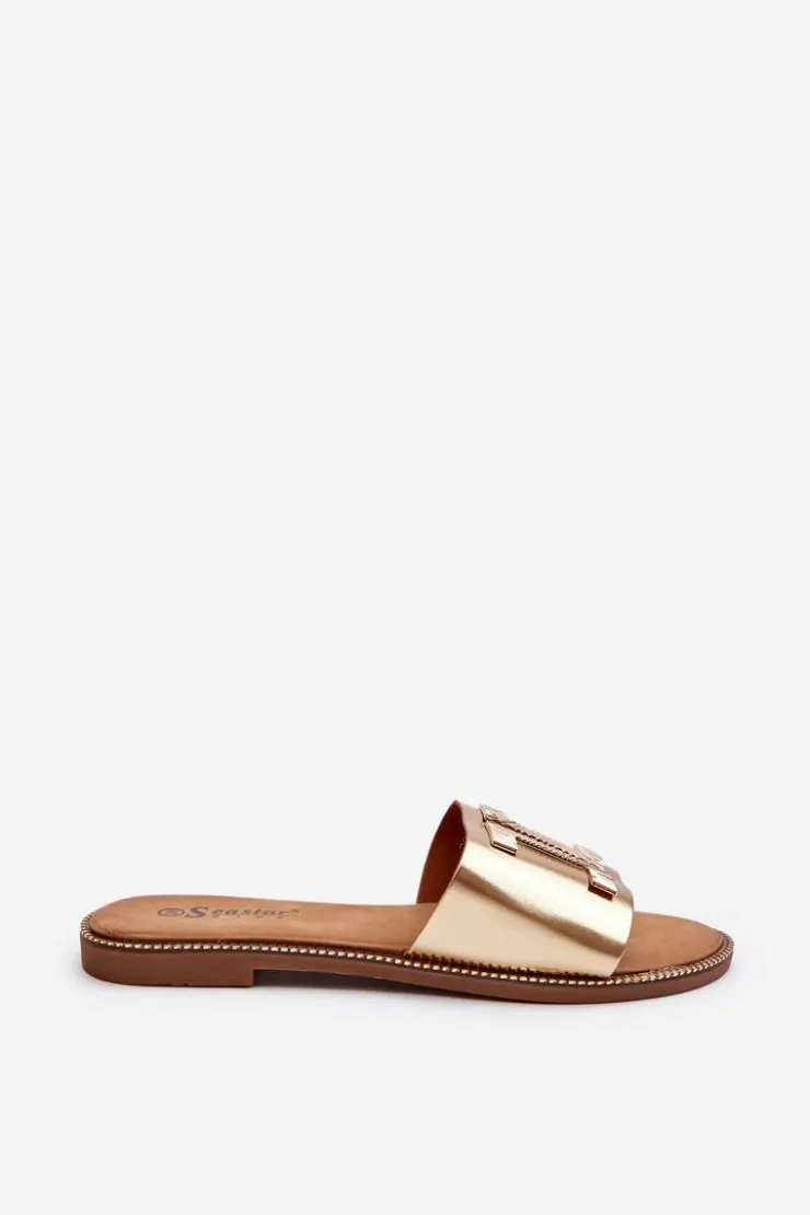 Klapki damskie na płaski obcasie, który gwarantuje stabilność i wygodę podczas noszenia. Na przodzie złota ozdoba, która dodaje im elegancji i subtelności. Model ten doskonale uzupełni letnie stylizacje! Przy wyborze rozmiaru prosimy sugerować się tabelą rozmiarów.