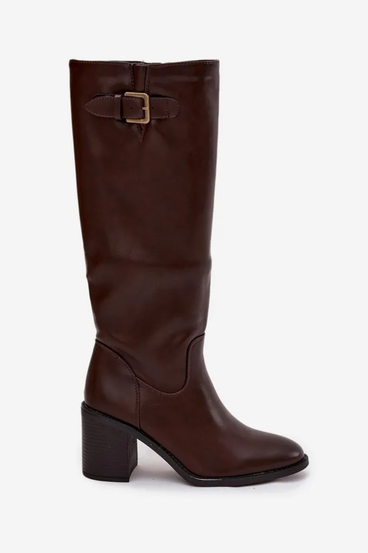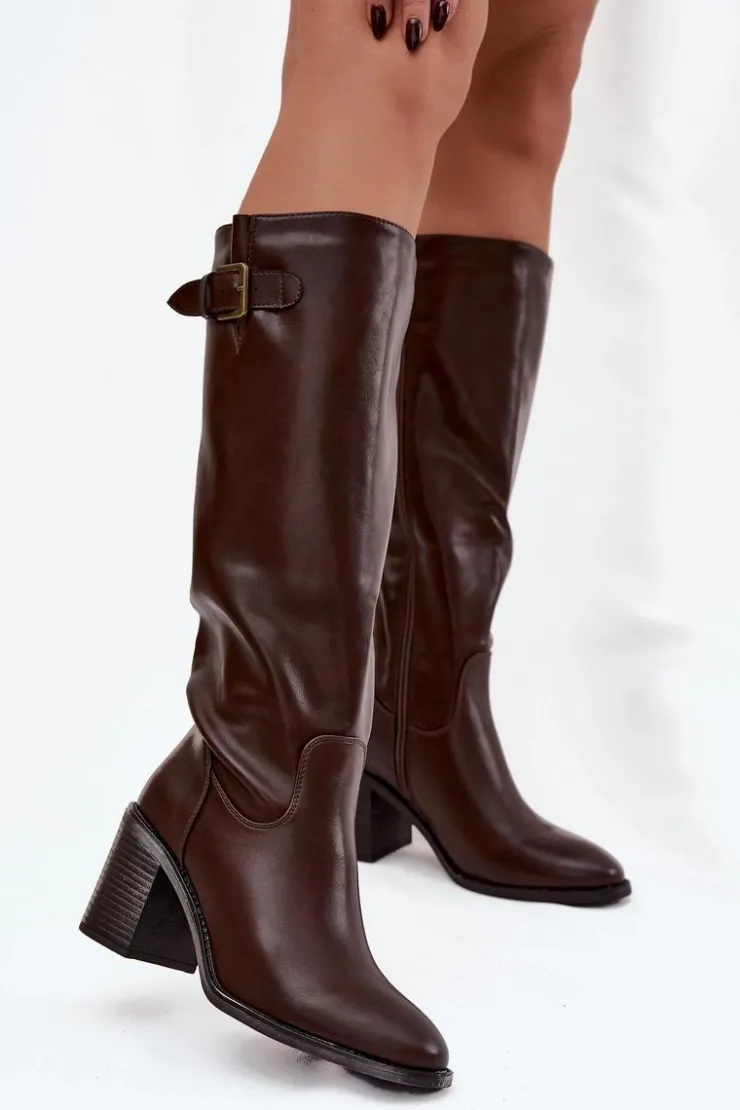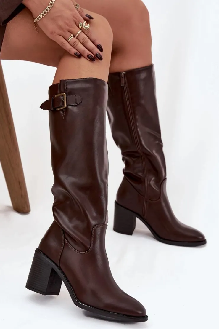 Kozaki damskie wykonane z eko skóry to elegancka i praktyczna propozycja na chłodniejsze dni. Model osadzony na stabilnym obcasie typu słupek zapewnia wygodę i pewność kroku, a zaokrąglone noski nadają całości klasycznego charakteru. Buty zapinane są na zamek, co ułatwia ich zakładanie i zdejmowanie. Na górze cholewki znajduje się ozdobna klamra, która dodaje im stylowego akcentu. Wnętrze ocieplone pianką pokrytą materiałem gwarantuje komfort i ciepło. To uniwersalne kozaki, które doskonale sprawdzą się zarówno w codziennych, jak i eleganckich stylizacjach. Przy wyborze rozmiaru prosimy sugerować się tabelą rozmiarów.