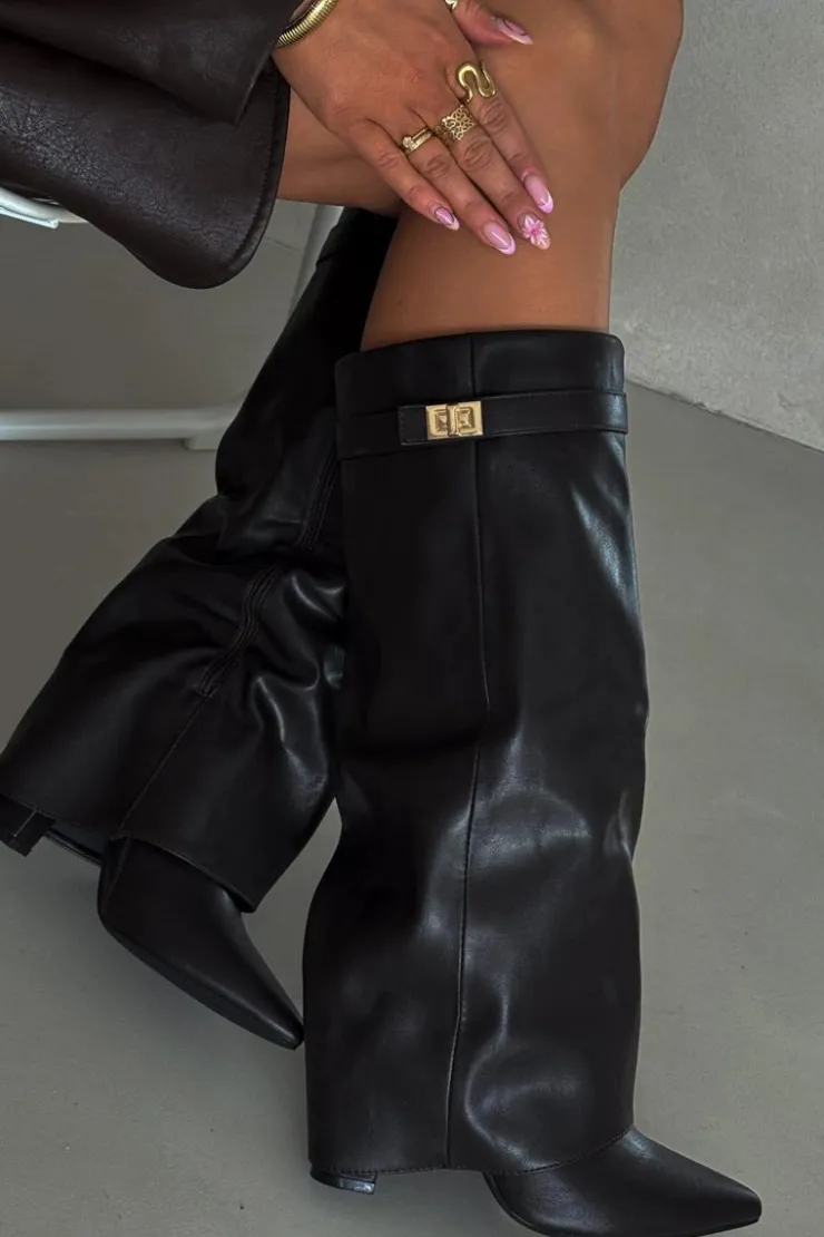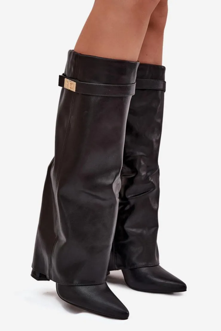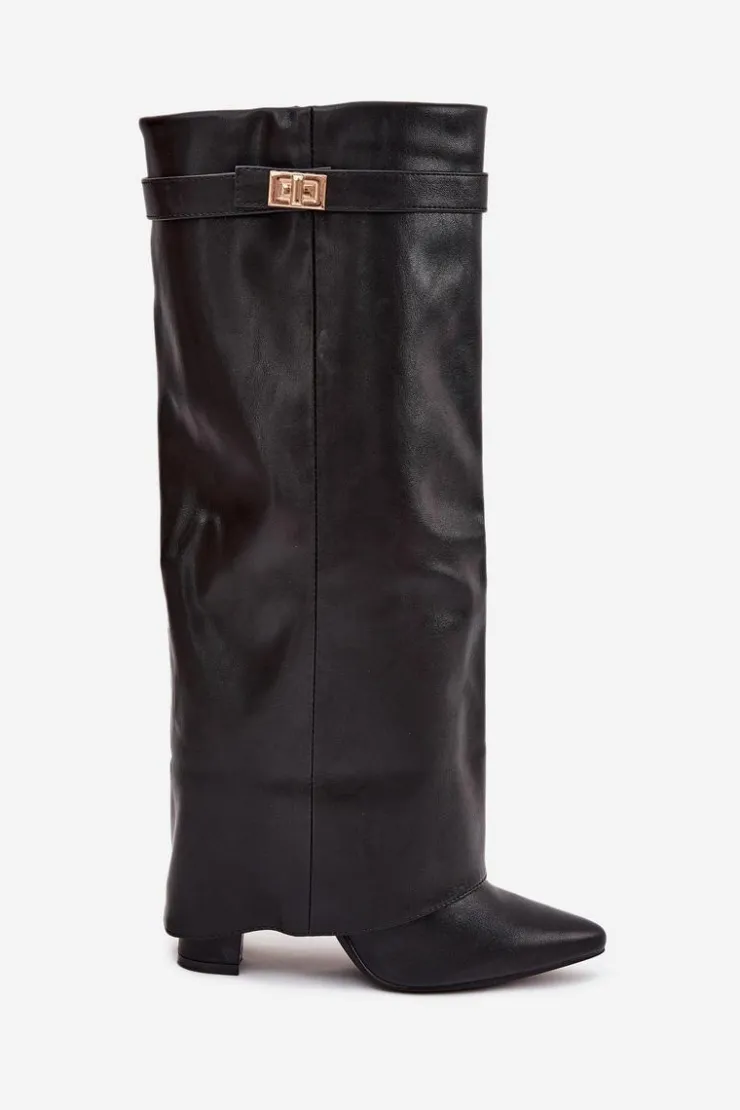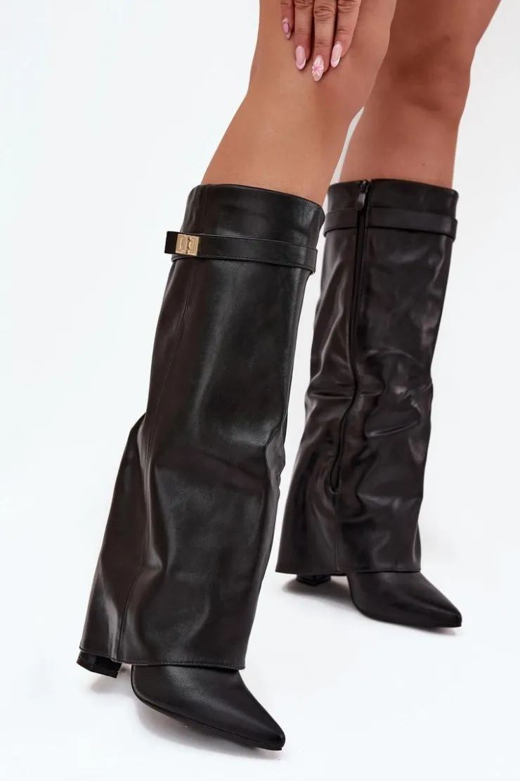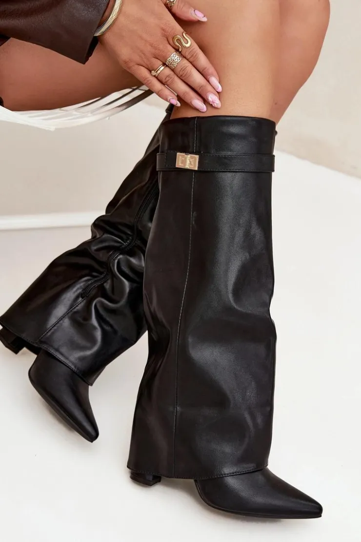 Kozaki damskie z eko skóry, sięgające przed kolano, to elegancka propozycja na chłodniejsze dni. Głównym atutem tego modelu jest wywinięta cholewka ozdobiona paseczkiem ze złotym detalem, który nadaje im wyjątkowego charakteru. Noski w szpic optycznie wysmuklają nogi, a obcas w formie słupka zapewnia stabilność i komfort. Zapinane na zamek, te kozaki będą doskonałym wyborem na eleganckie wyjścia oraz codzienne stylizacje. Przy wyborze rozmiaru prosimy sugerować się tabelą rozmiarów.