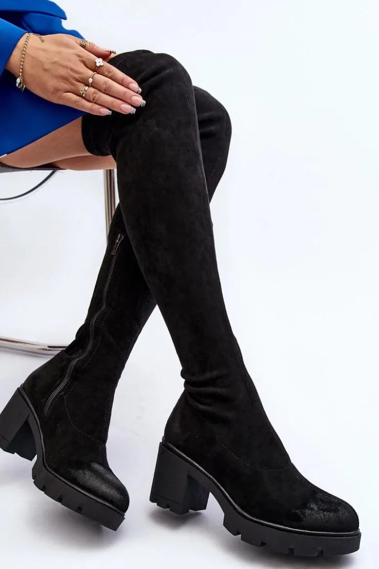 Kozaki damskie zostały wykonane z wysokiej jakości eko zamszu z dbałością o szczegóły. Osadzone na grubej podeszwie oraz obcasie w postaci słupka. Model wsuwany, z dodatkowym zapięciem na suwak. Noski zaokrąglone. Ocieplone wyłącznie na wysokości stopy lekkim futerkiem. Cholewka za kolano. Koniecznie musisz je mieć! Przy wyborze rozmiaru prosimy sugerować się tabelą rozmiarów.