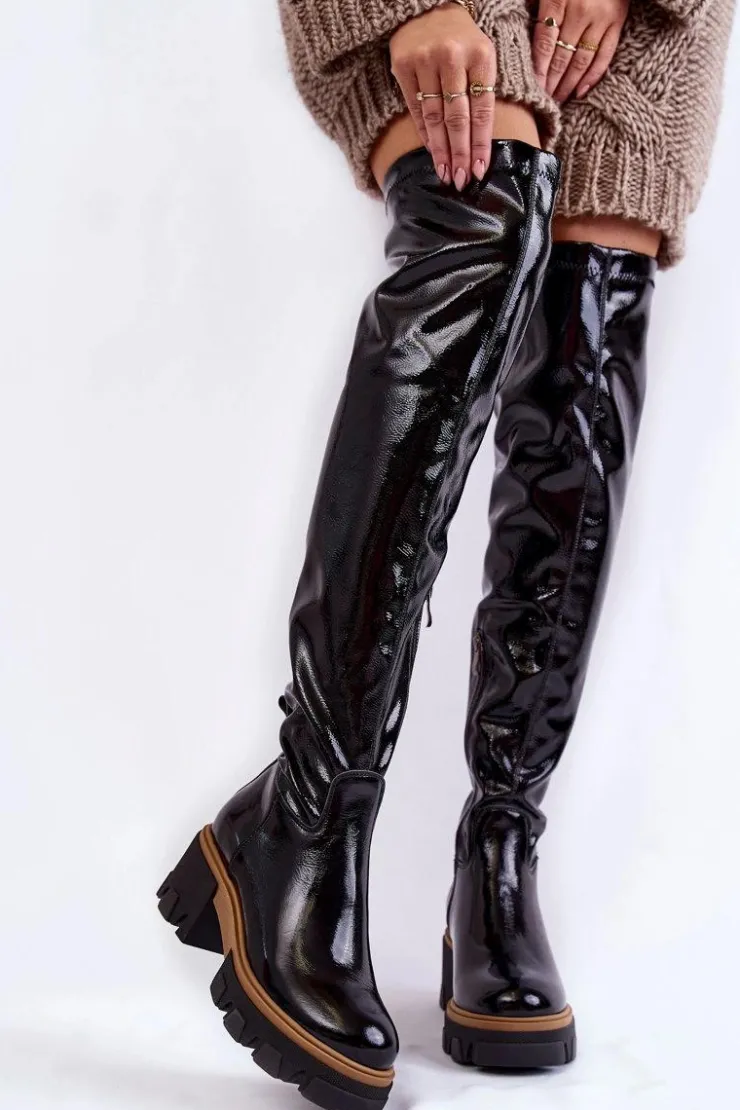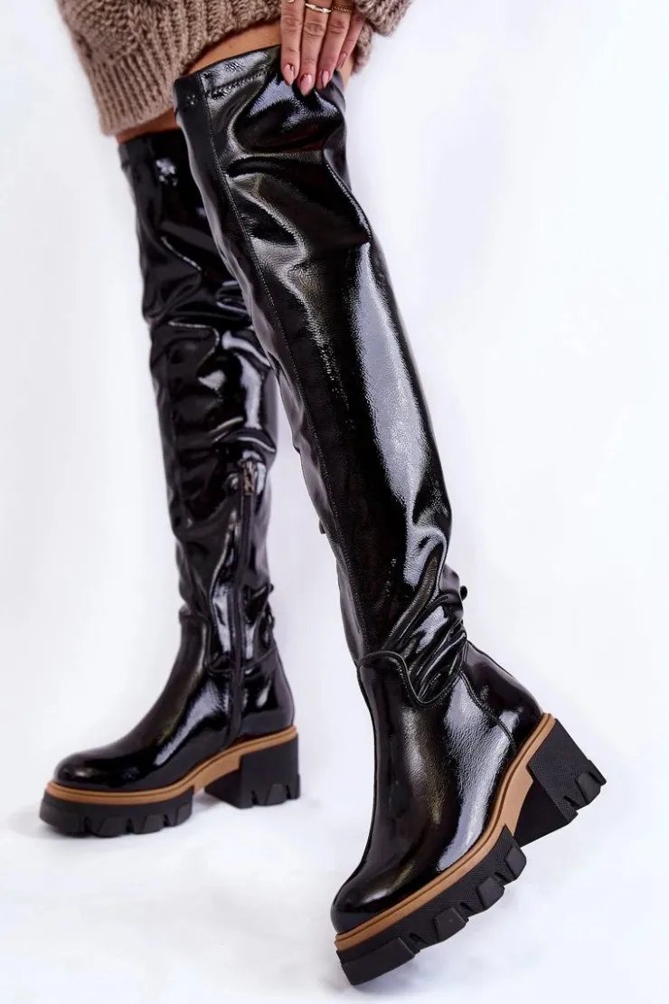 Wyjątkowe kozaki muszkieterki zostały wykonane z wysokiej jakości naturalnej skóry. Model wsuwany, z suwakiem na boku. Kozaki osadzono na masywnym obcasie i platformie ze żłobieniami. Zapiętek jest usztywniany. W środku zostały ocieplone na wysokości stopy kocem obuwniczym, a na pozostałej wysokości materiałem. Przy wyborze rozmiaru prosimy kierować tabelą rozmiarów.