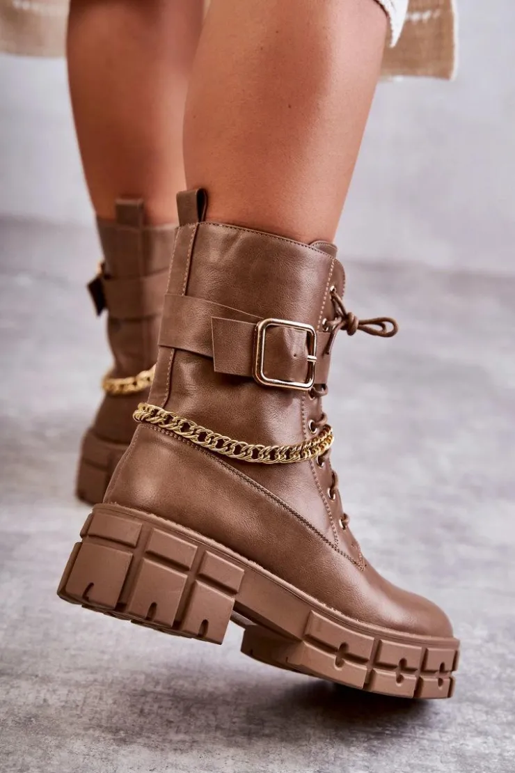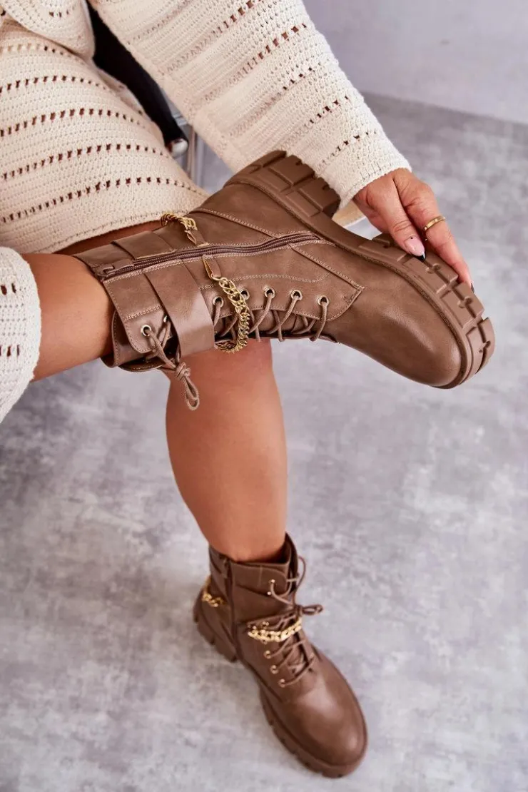 Niezwykłe i stylowe botki wykonane z eko skóry. Zapinane z boku cholewki na zamek oraz sznurowane. Dodatkowo botki posiadają regulowany pasek z klamrą. Ozdobny łańcuch jest przymocowany do cholewki i nie jest ściągany. Botki są wykonane z eko skóry. Posiadają ocieplenie w postaci koca obuwniczego. Osadzone na masywnym, płaskim obcasie i platformie. Przy wyborze rozmiaru prosimy sugerować się tabelą rozmiarów.