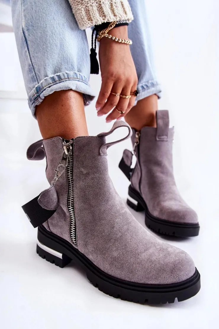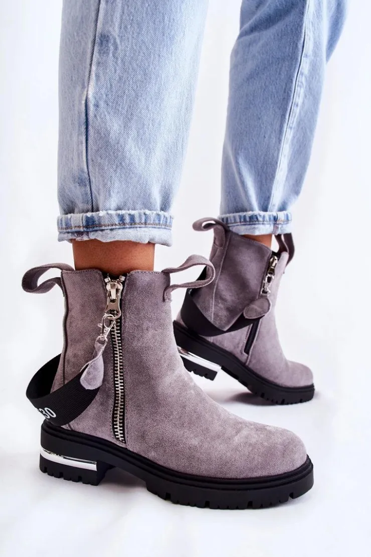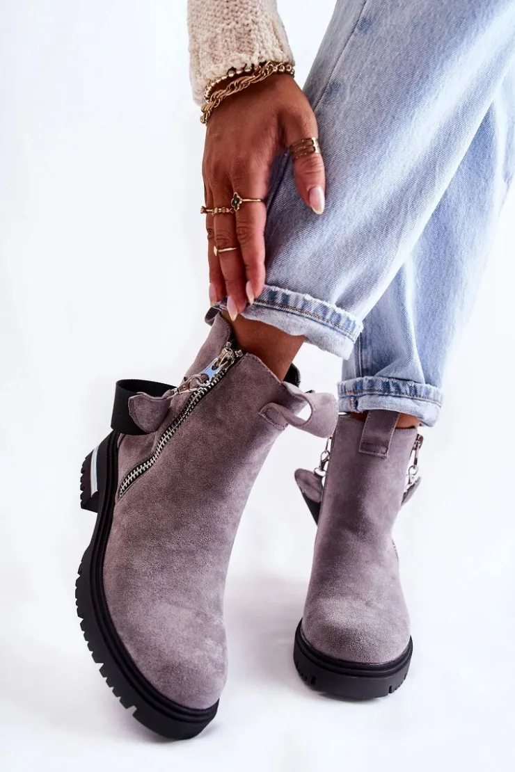 Botki damskie zostały wykonane z eko zamszu. Wnętrze ocieplone jest miłym w dotyku kocem obuwniczym. Dołączony do butów pasek jest odpinany. Botki posiadają dwa zamki, gdzie jeden z nich jest nieodpinany. Buty te osadzono na płaskim obcasie z lustrzaną wstawką i podeszwie z bieżnikiem. Świetny model do wielu jesiennych stylizacji! Przy wyborze rozmiaru prosimy sugerować się tabelą rozmiarów.