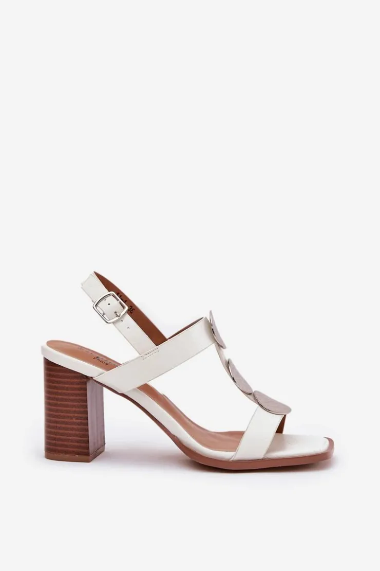 Stylowe sandały damskie wykonane z eko skóry, osadzone na słupkowym obcasie. Regulowany pasek ze sprzączką zapewnia idealne dopasowanie do stopy. Z przodu subtelne ozdoby dodają im wyjątkowego uroku. Doskonały wybór na letnie dni, zarówno do codziennych, jak i bardziej eleganckich stylizacji.Przy wyborze rozmiaru prosimy sugerować się tabelą rozmiarów.
