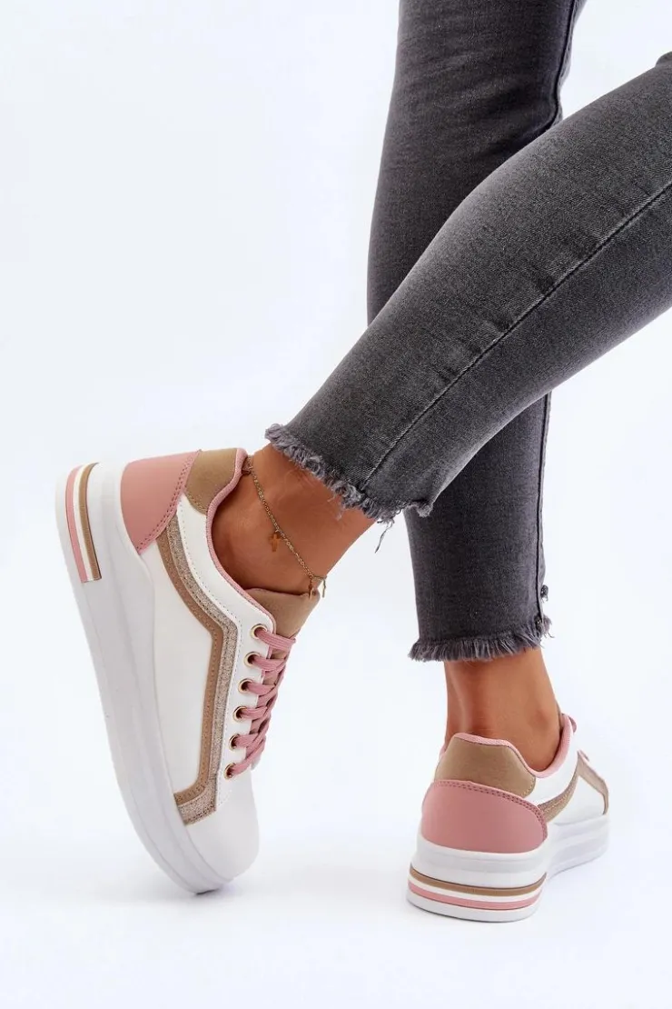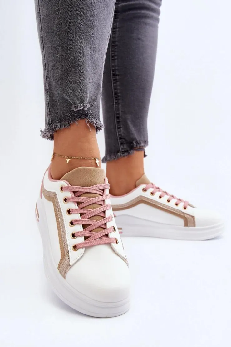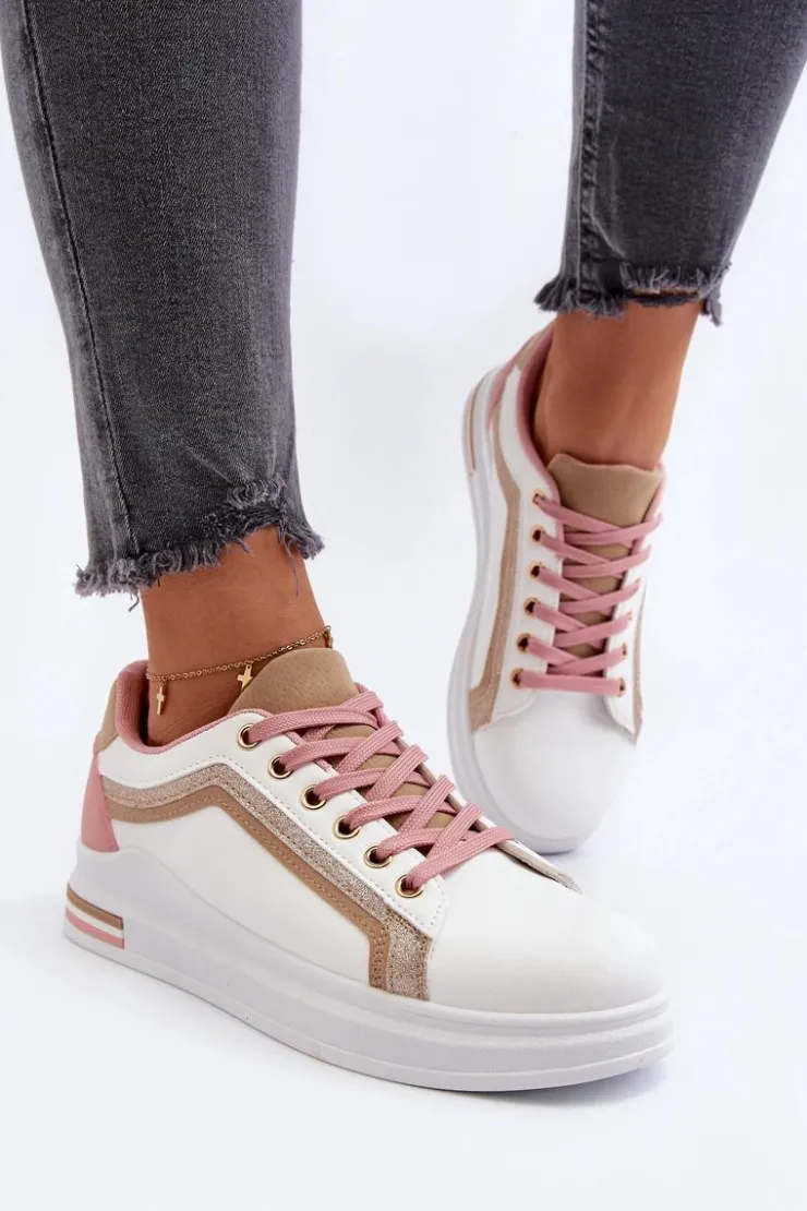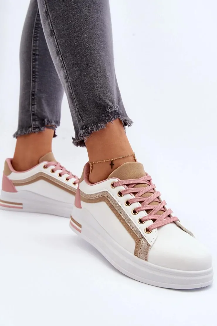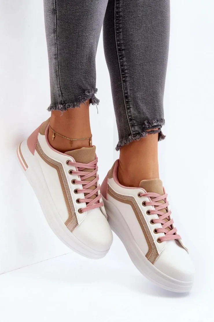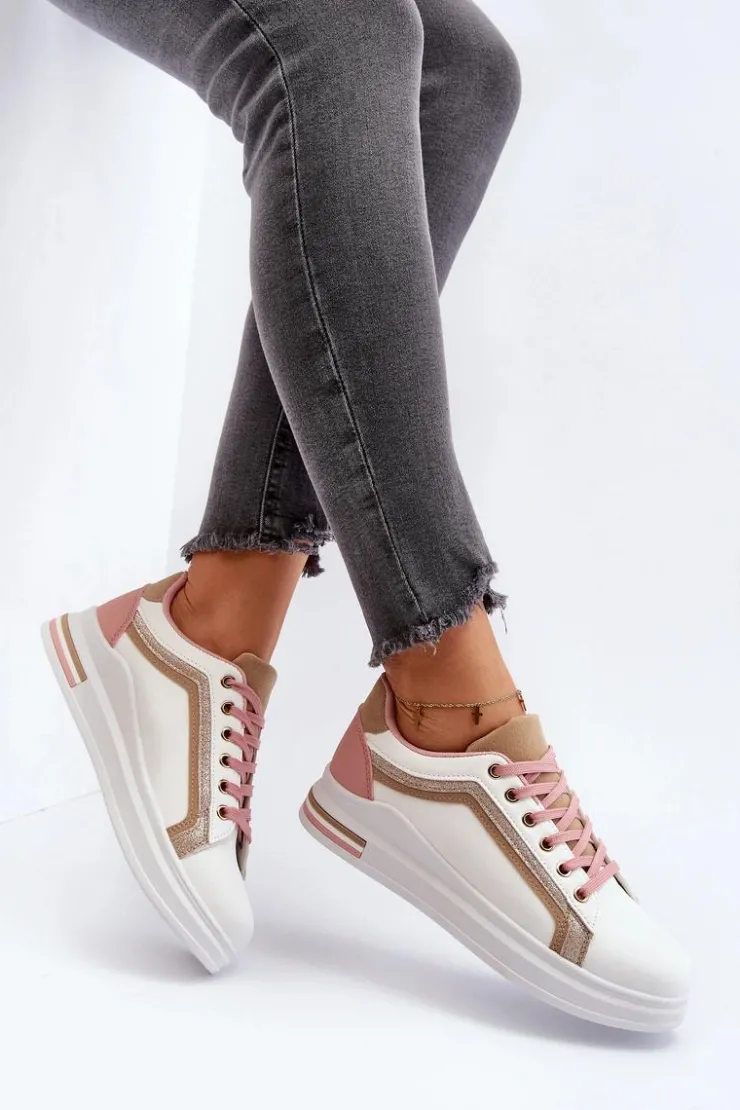 Sneakersy damskie osadzone na platformie. Cholewka ozdobiona przeszyciami oraz brokatem. Miękka wkładka z pianki zapewni wygodę podczas użytkowania, dodatkowo jest ona wyjmowana. Noski zaokrąglone. Ten ciekawy fason z pewnością dopełni wiele wiosennych stylizacji! Przy wyborze rozmiaru prosimy kierować się tabelą rozmiarów.