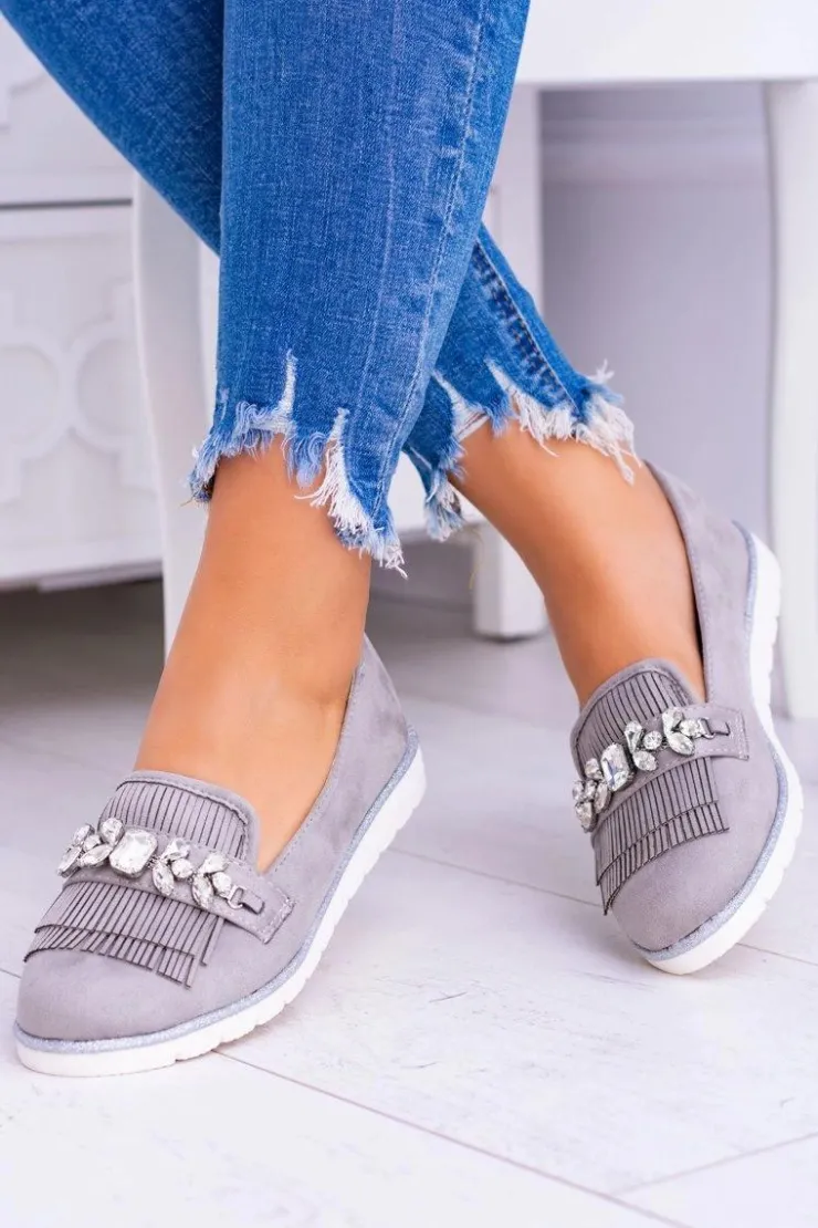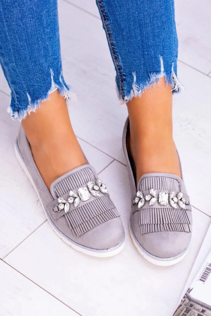 Discount Boto Szare Zamszowe Mokasyny z Kryształami Vivaro