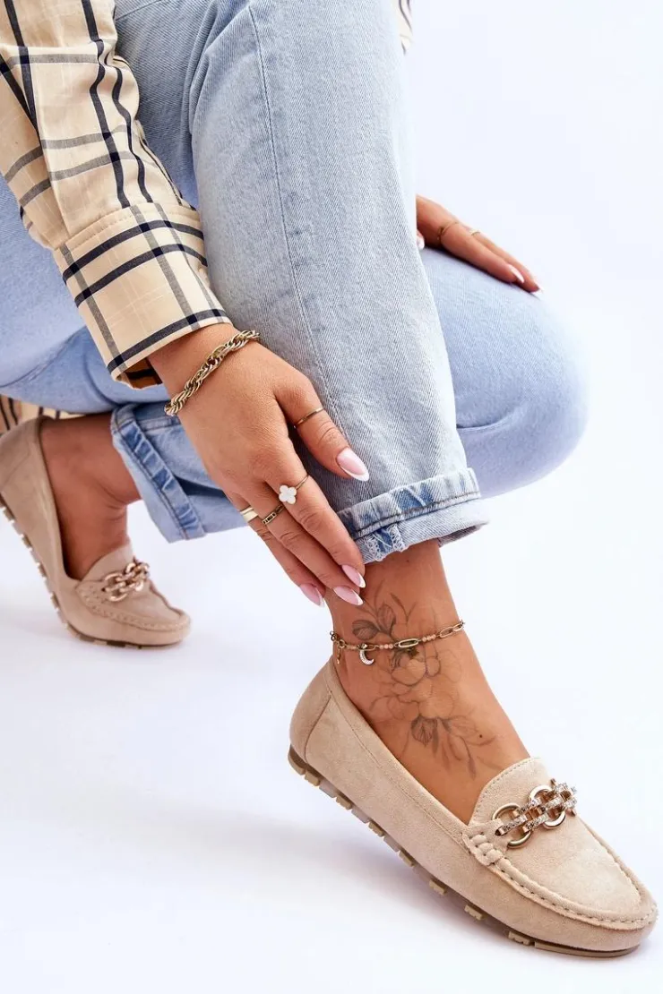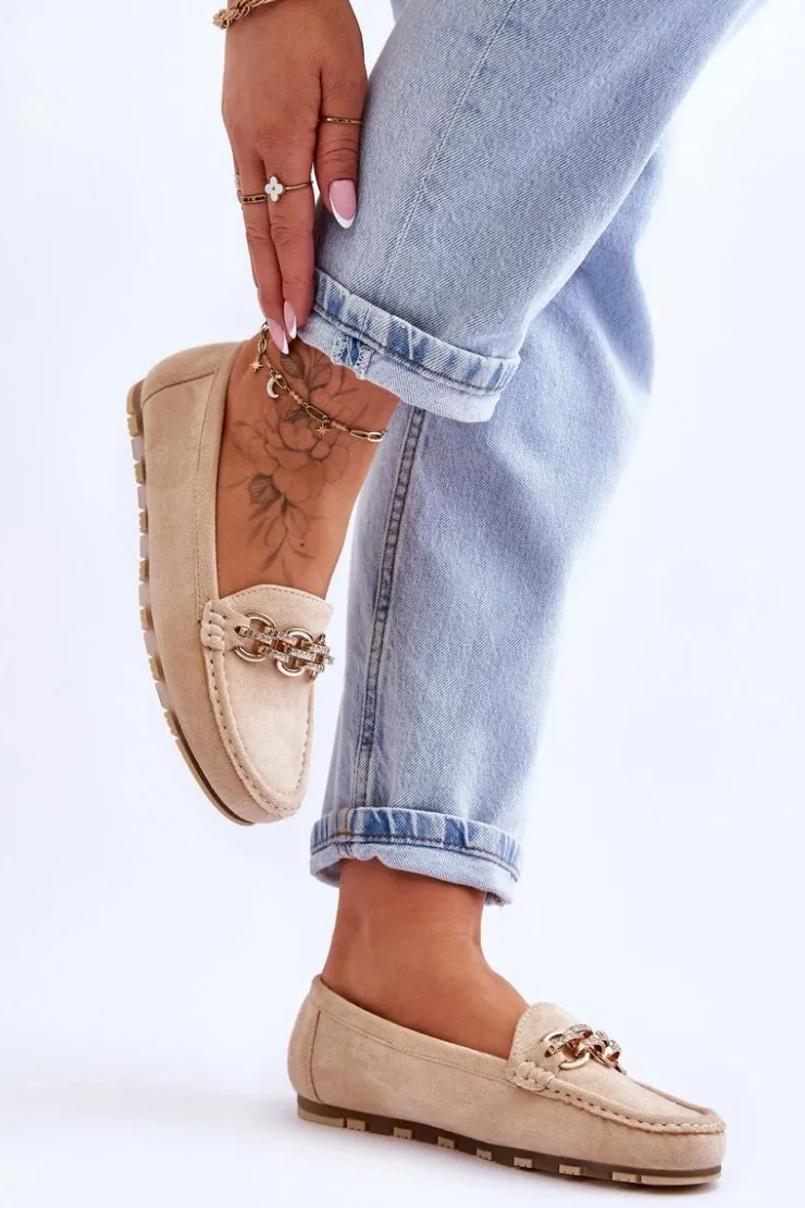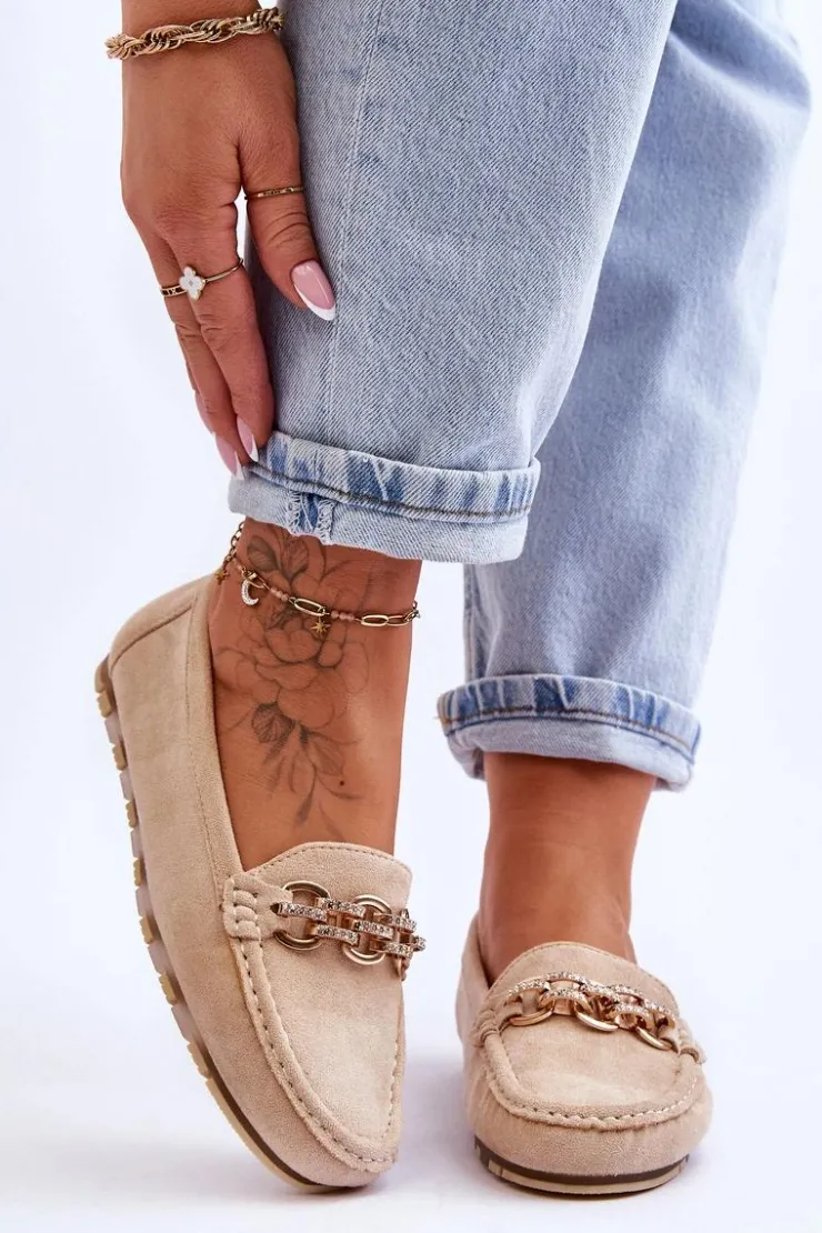 Mokasyny damskie zostały wykonane z eko zamszu. Posiadają na przodzie ozdobny łańcuszek z dżetami. Mokasyny zostały osadzone na platformie z gumową, antypoślizgową podeszwą. Miękka wkładka z eko skóry zapewni komfortowe użytkowanie. Koniecznie powinnaś je mieć! Przy wyborze rozmiaru prosimy sugerować się tabelą rozmiarów.