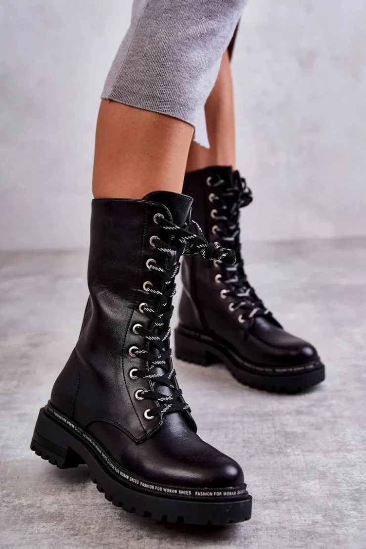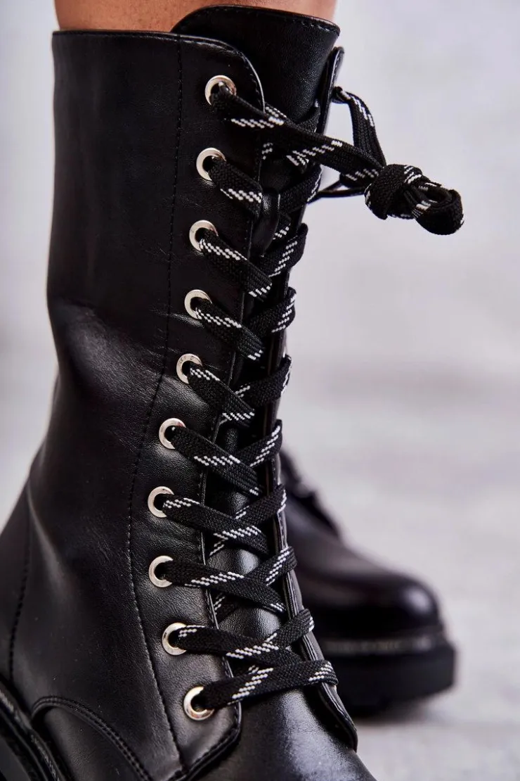 Botki z wysoką cholewką zostały wykonane z eko skóry. Model z usztywnianym zapiętkiem. Botki te posiadają suwak ułatwiający zakładanie obuwia oraz wiązanie pozwalające na odpowiednie dopasowanie obuwia do tęgości nogi. Osadzone na platformie i płaskim obcasie. Posiadają ocieplenie w postaci koca obuwniczego. Świetny model do wielu stylizacji! Przy wyborze rozmiaru prosimy sugerować się tabelą rozmiarów.