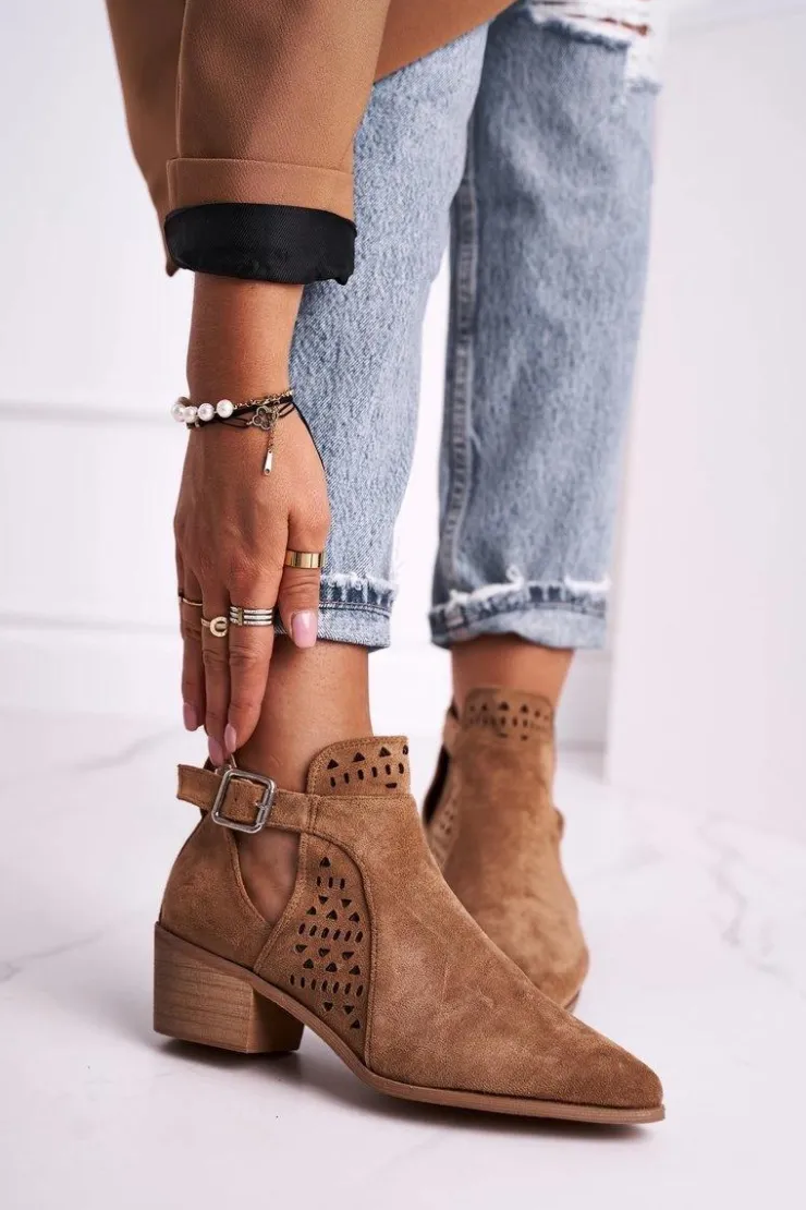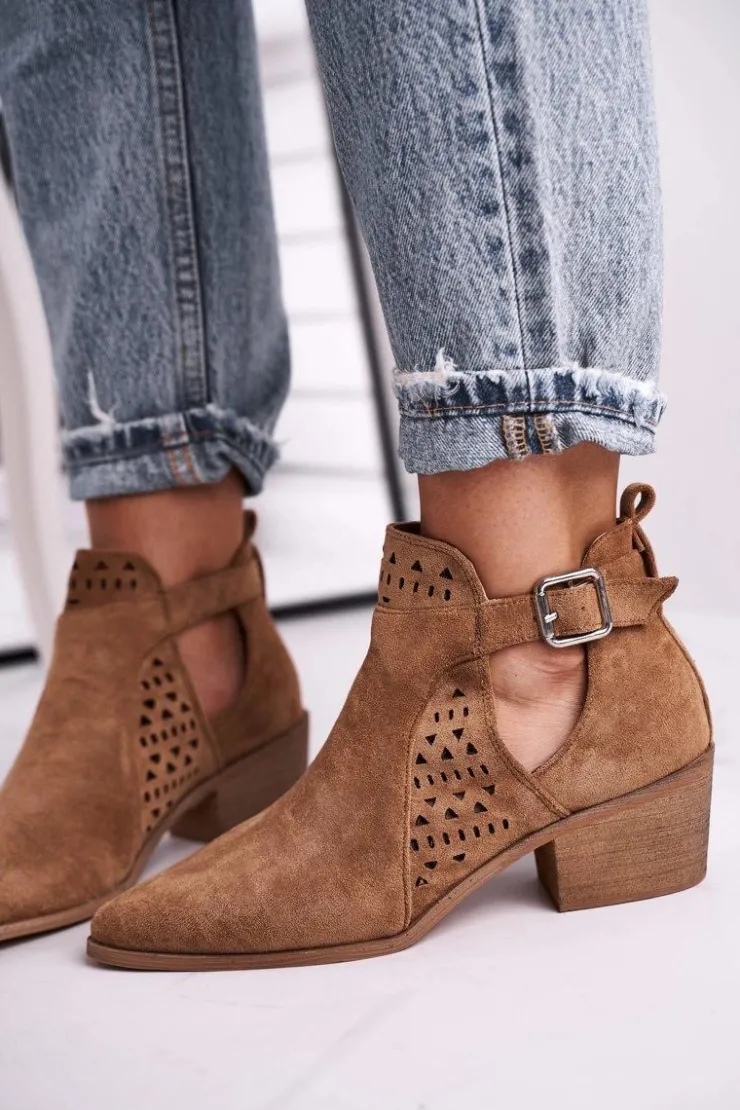 Piękne botki z noskiem w szpic wykonane z eko zamszu. Przy wyborze rozmiaru prosimy sugerować się tabelą rozmiarów.