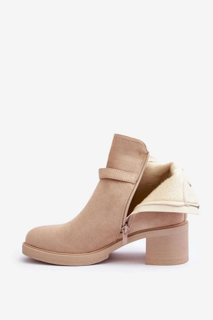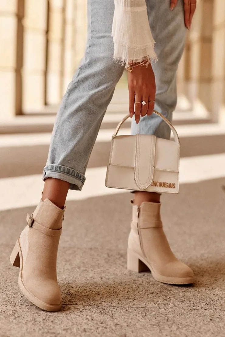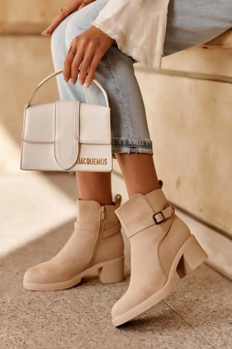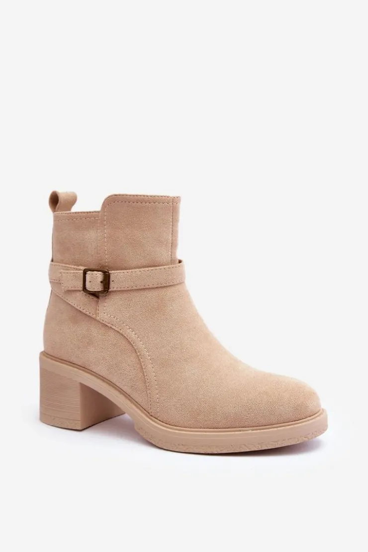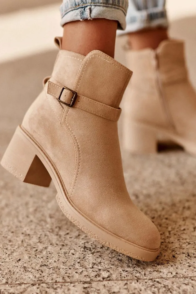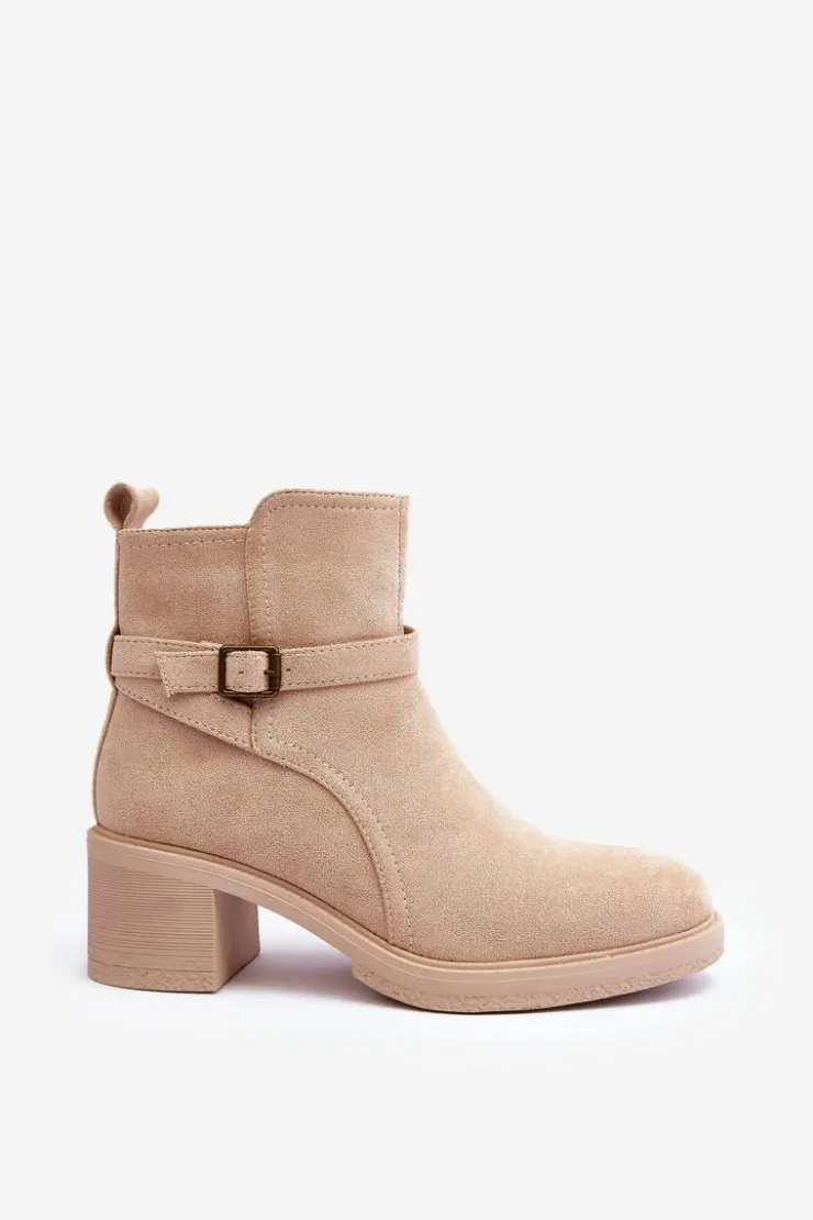 Klasyczne botki wykonane z eko zamszu. Osadzone na obcasie w postaci klocka. Wnętrze ocieplone kocem obuwniczym. Z boku cholewki znajduje się pasek z klamrą. Modny fason sprawia, że możesz założyć je do wielu stylizacji. Nosek zaokrąglony. Buty posiadają także usztywniany zapiętek. W tych botkach jesienne dni nie będą już takie straszne! Przy wyborze rozmiaru prosimy sugerować się tabelą rozmiarów.