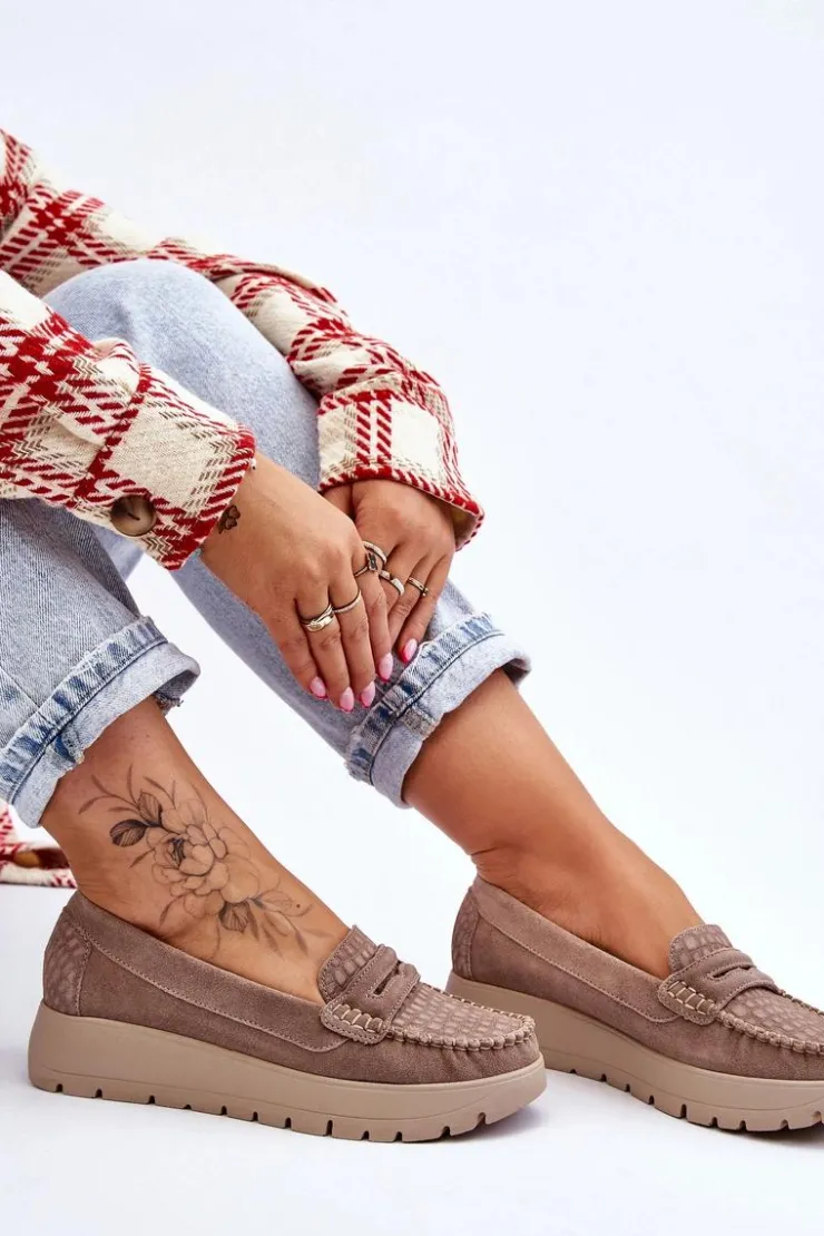 Mokasyny damskie wykonane z naturalnej skóry z ozdobnym paseczkiem z przodu. Zapiętek został usztywniony, co pozwoli na odpowiednią stabilizację stopy. Buty osadzono na platformie. Ten model posiada miękką wkładkę z perforacją. Mokasyny to idealne buty do wielu stylizacji! Koniecznie powinnaś je mieć! Przy wyborze rozmiaru prosimy sugerować się tabelą rozmiarów.