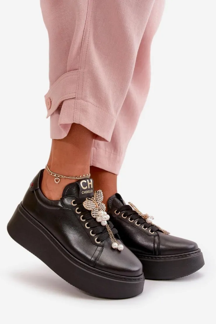 Sneakersy damskie od marki CheBello. Wykonane z wysokiej jakości skóry naturalnej. Osadzone na platformie. Noski zaokrąglone. Szczególnym atutem tego modelu jest piękny ozdobny motyl na sznurowaniu. Buty te to świetna propozycja dla osób, które chcą połączyć wygodę z elegancją w codziennych stylizacjach! Przy wyborze rozmiaru prosimy sugerować się tabelą rozmiarów.