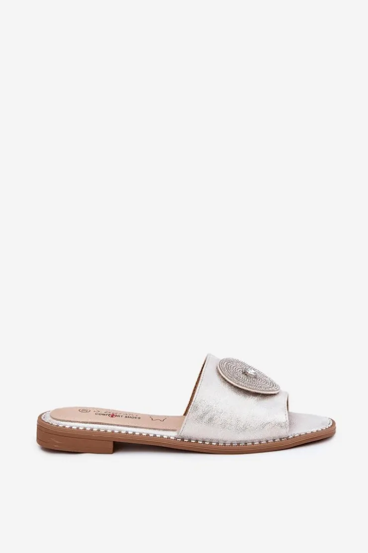 Eleganckie klapki damskie wykonane z wysokiej jakości eko skóry. Osadzone na płaskim obcasie, zapewniają stabilność i wygodę przez cały dzień. Skórzana wkładka gwarantuje komfort i odpowiednią wentylację, dbając o wygodę stóp nawet w ciepłe dni. Z przodu znajduje się ozdoba, która dodaje wyjątkowego uroku i elegancji, czyniąc je doskonałym wyborem do letnich stylizacji. Te klapki to świetna opcja zarówno do casualowych, jak i bardziej eleganckich zestawów. Przy wyborze rozmiaru prosimy sugerować się tabelą rozmiarów.