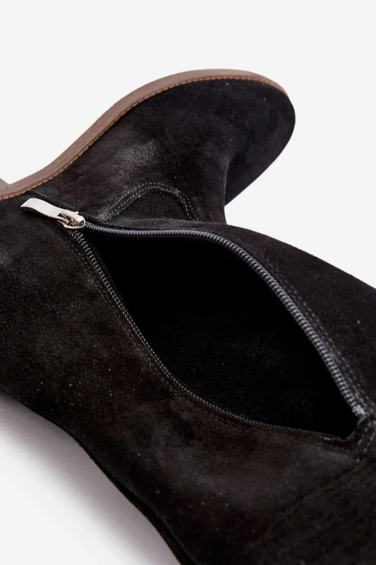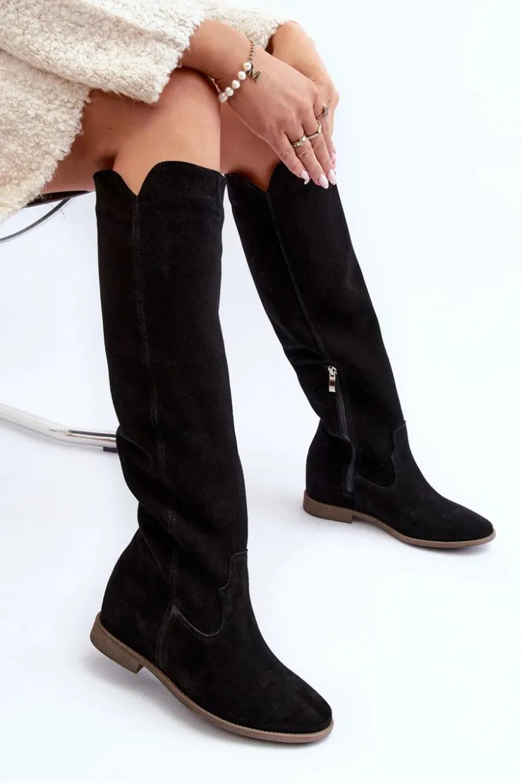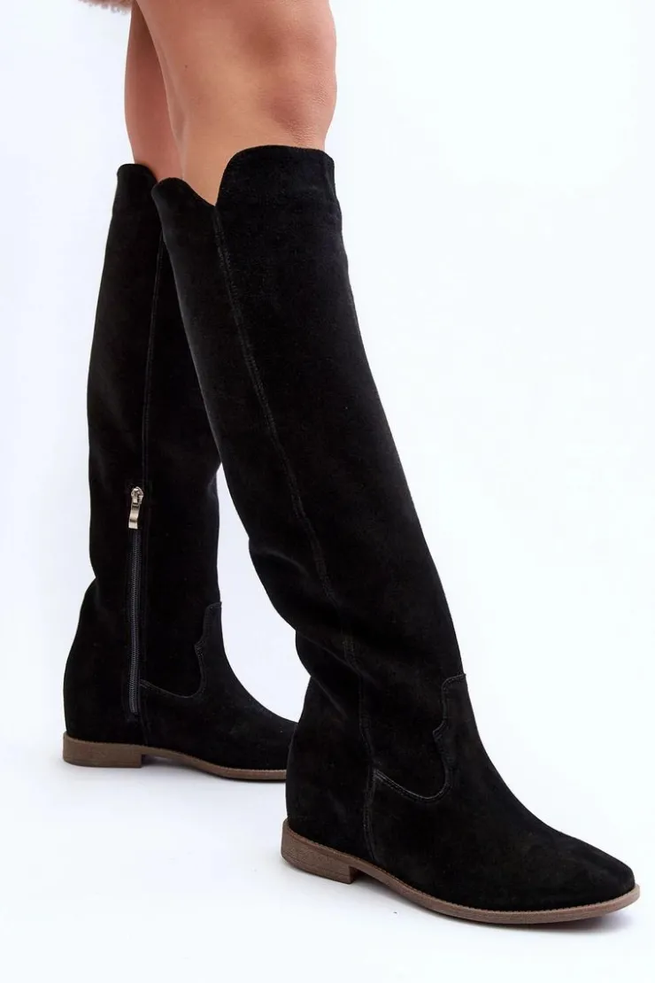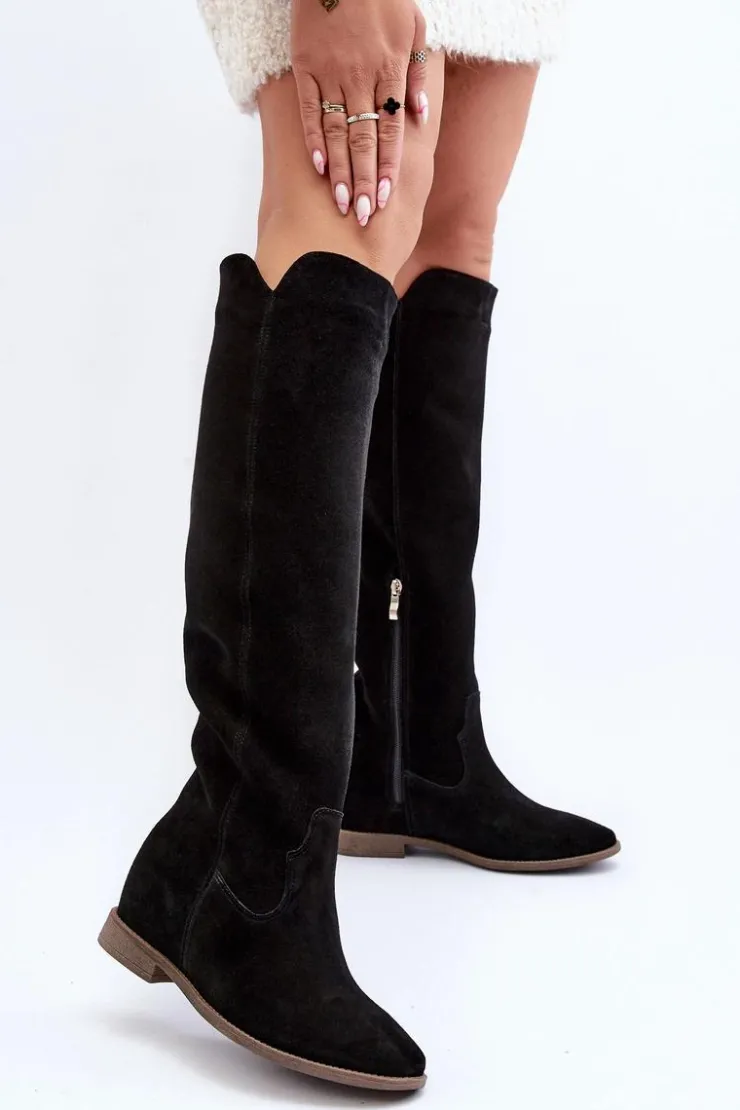 Kozaki damskie zostały wykonane z wysokiej jakości naturalnego zamszu. Osadzone na płaskim obcasie oraz ukrytym koturnie. Cholewka do kolana z wycięciami na bokach. Noski zaokrąglone. Środek lekko ocieplony kocem obuwniczym. Ten modny fason świetnie sprawdzi się w wielu wiosenno-jesiennych stylizacjach! Przy wyborze rozmiaru prosimy sugerować się tabelą rozmiarów.