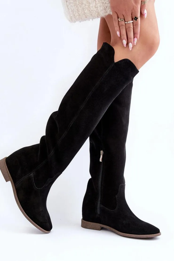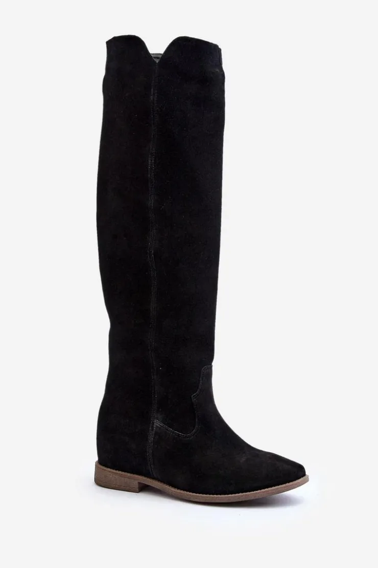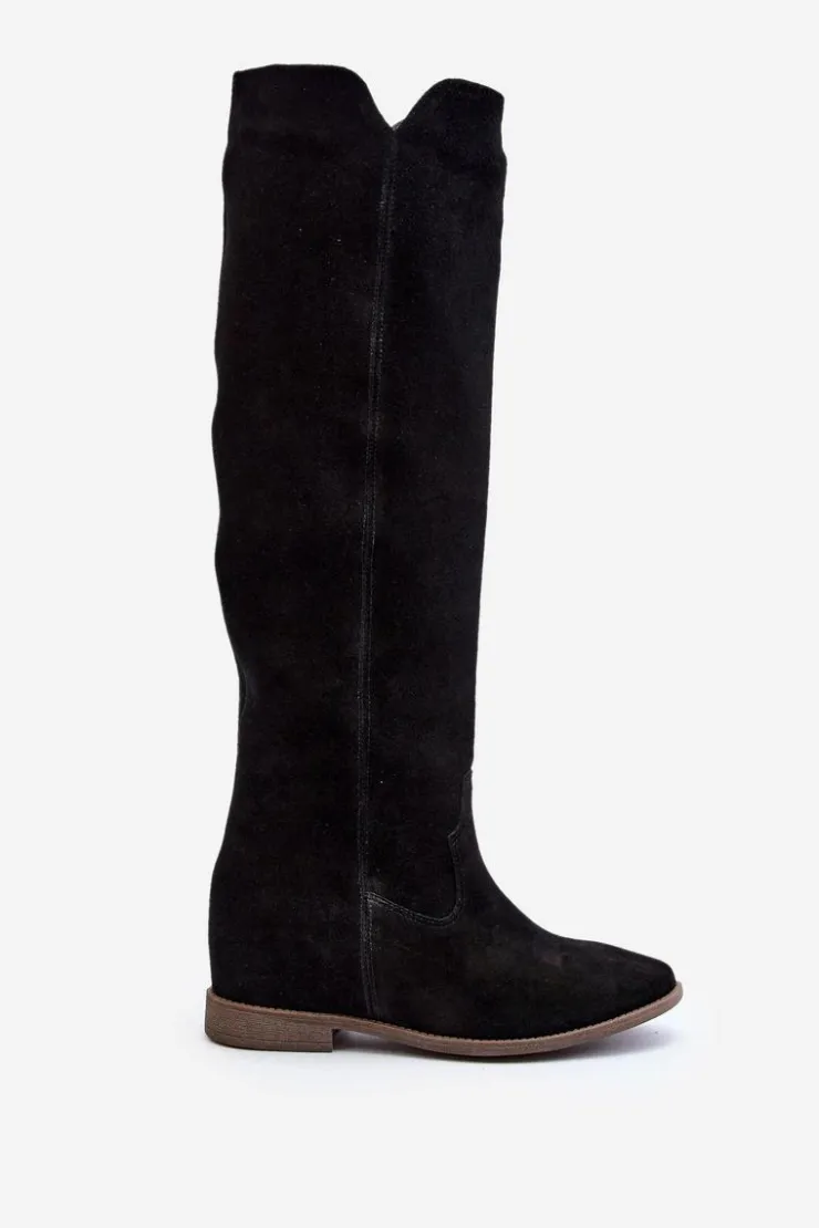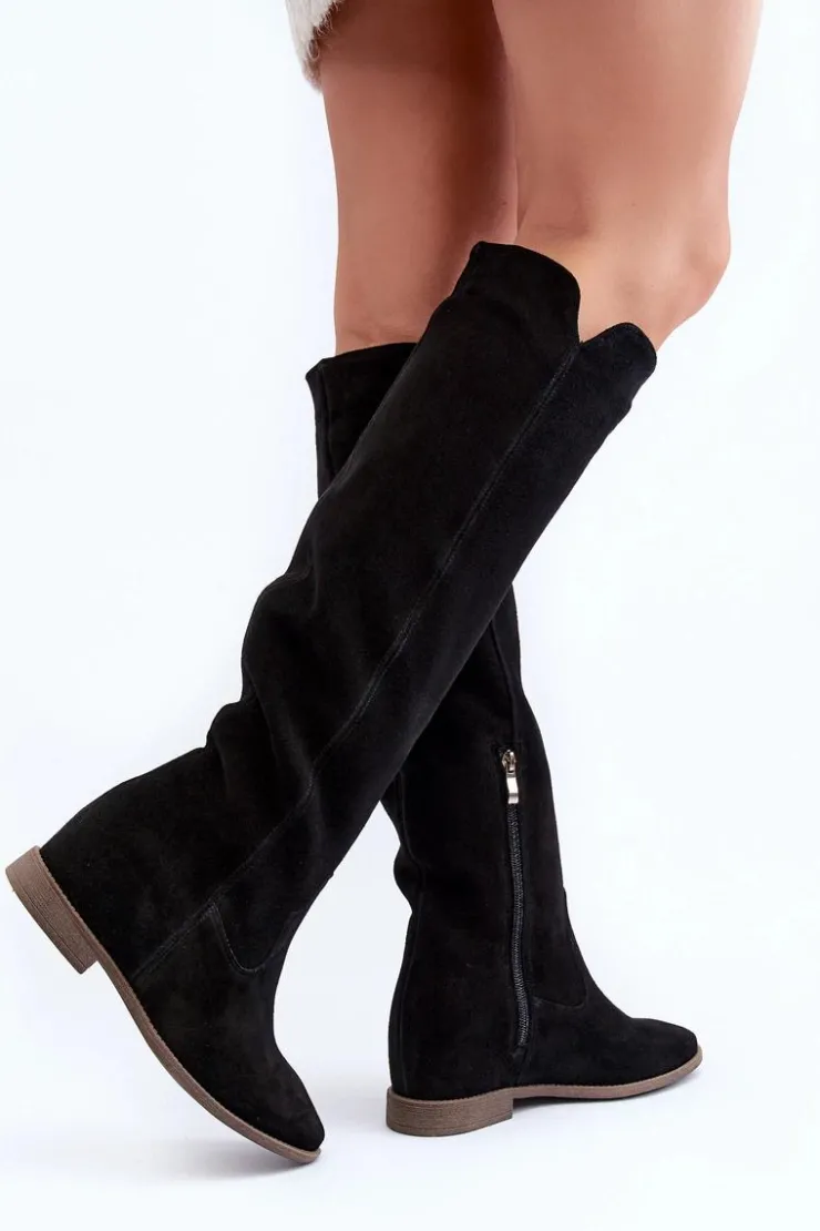 Kozaki damskie zostały wykonane z wysokiej jakości naturalnego zamszu. Osadzone na płaskim obcasie oraz ukrytym koturnie. Cholewka do kolana z wycięciami na bokach. Noski zaokrąglone. Środek lekko ocieplony kocem obuwniczym. Ten modny fason świetnie sprawdzi się w wielu wiosenno-jesiennych stylizacjach! Przy wyborze rozmiaru prosimy sugerować się tabelą rozmiarów.