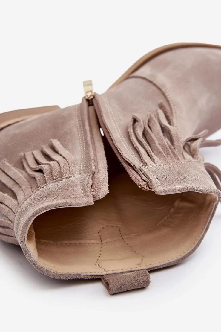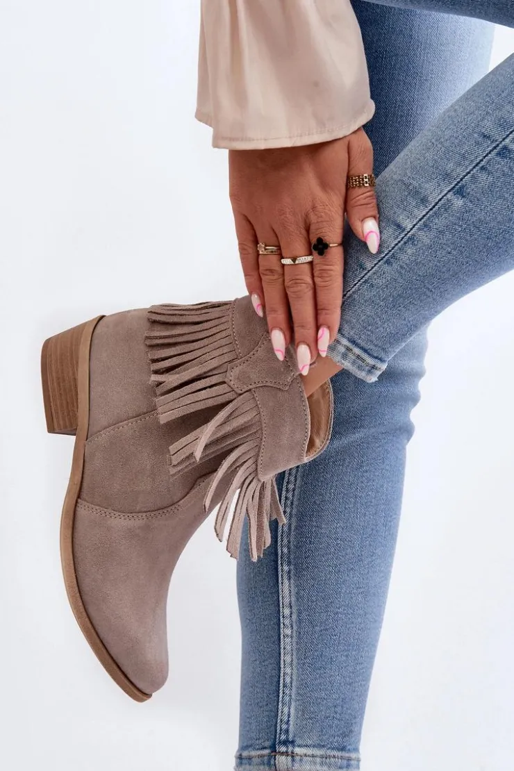 Botki damskie wykonane ze skóry naturalnej. Zapinane na suwak. Cholewka ozdobiona frędzlami. Noski w szpic optycznie wysmuklą nogi. Model ten będzie doskonałym dopełnieniem wiosennych stylizacji. Idealne do spódnic, sukienek, jak i spodni. Fason ten z pewnością przyciągnie uwagę swoim unikalnym stylem. Koniecznie powinnaś je mieć! Przy wyborze rozmiaru prosimy sugerować się tabelą rozmiarów.