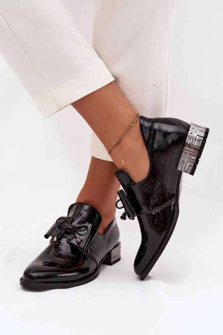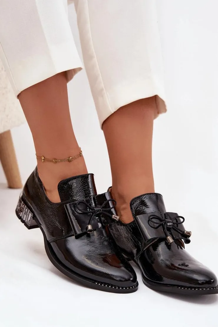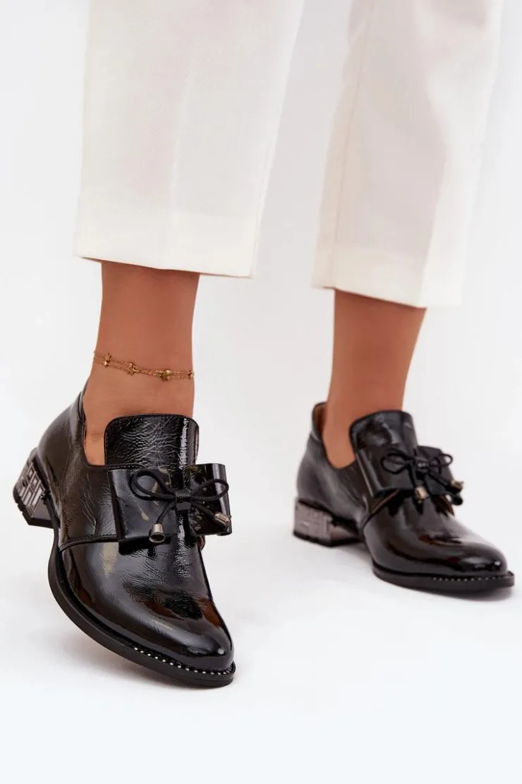 Półbuty damskie wykonane z naturalnej skóry to elegancka propozycja na co dzień i wyjątkowe okazje. Osadzone na niskim, ozdobnym obcasie zapewniają wygodę oraz subtelny, kobiecy wygląd. Klasyczny fason wsuwany ułatwia zakładanie, a uroku dodaje kokardka umieszczona z przodu buta. Dodatkowym akcentem są błyszczące cyrkonie zdobiące podeszwę przy nosku, które nadają całości szykownego, efektownego charakteru. To półbuty, które pięknie dopełnią zarówno casualowe stylizacje, jak i bardziej eleganckie zestawy.