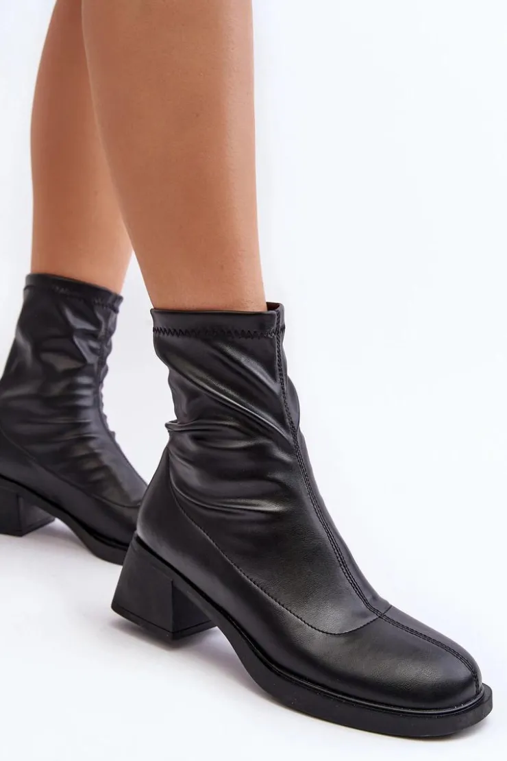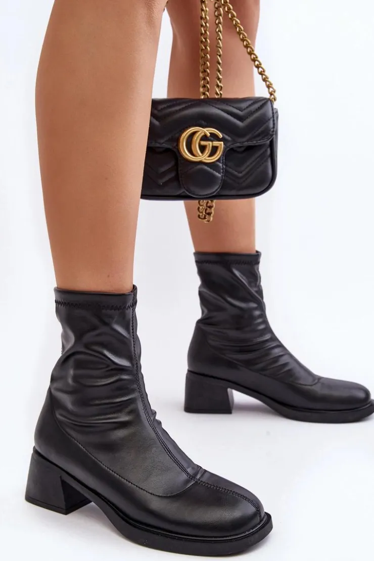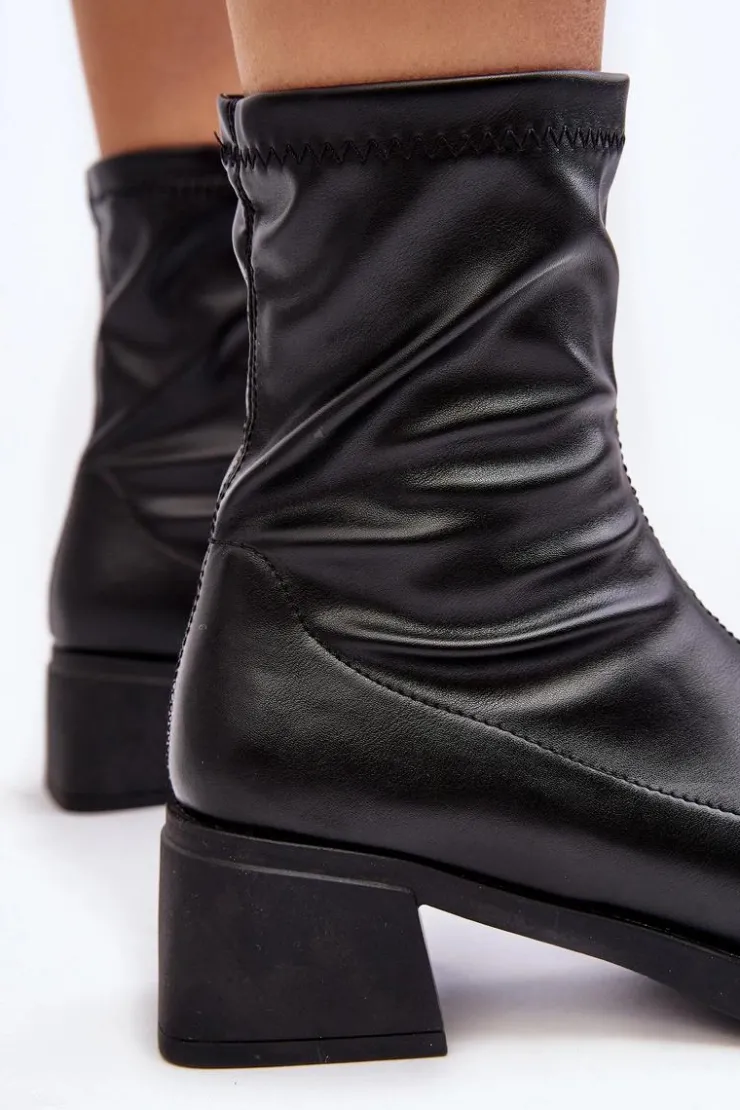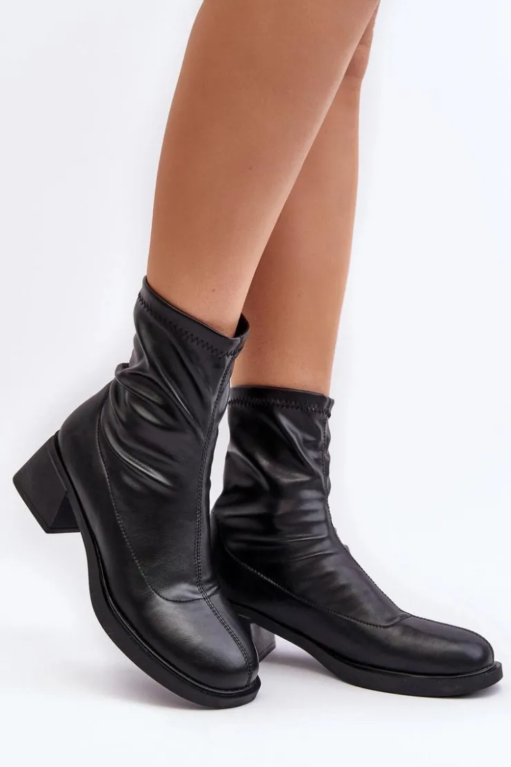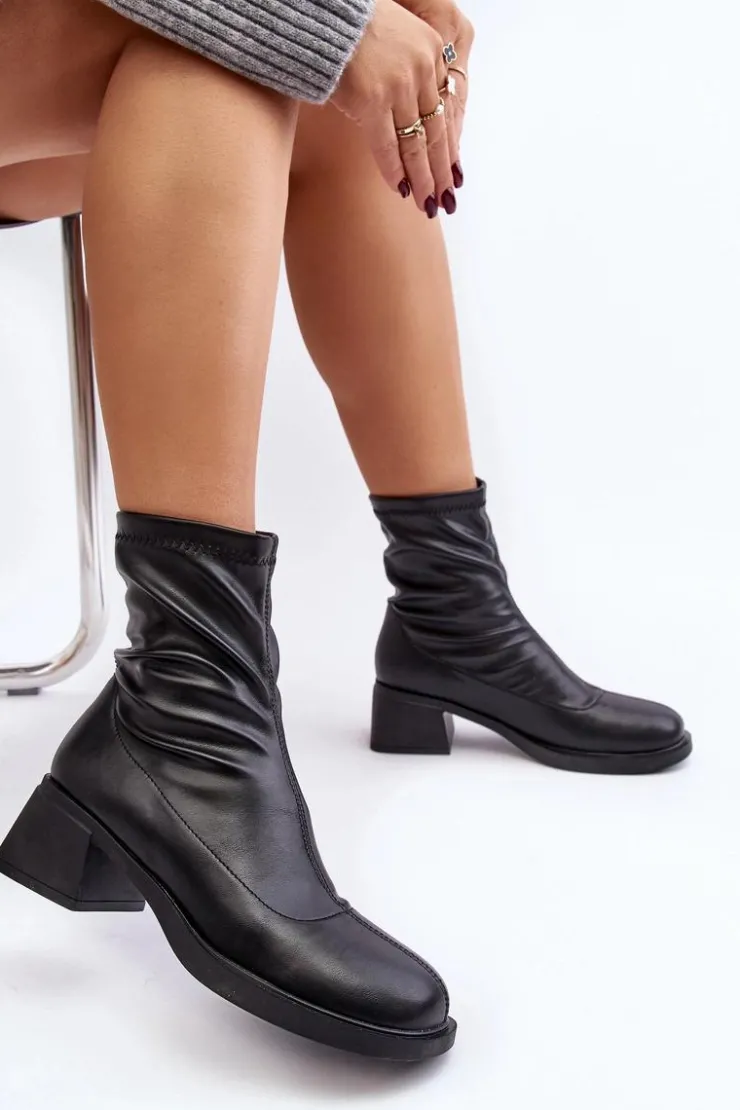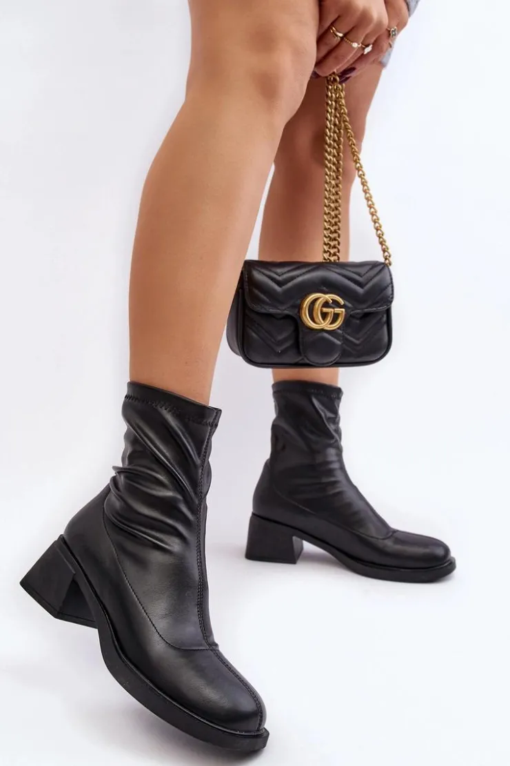 Damskie, wsuwane botki wykonane z eko skóry. Osadzone na niskim obcasie w postaci klocka. Noski zaokrąglone. Cholewka za kostkę. Klasyczny fason, który dopasujesz do niemalże każdej jesiennej stylizacji! Przy wyborze rozmiaru prosimy sugerować się tabelą rozmiarów.