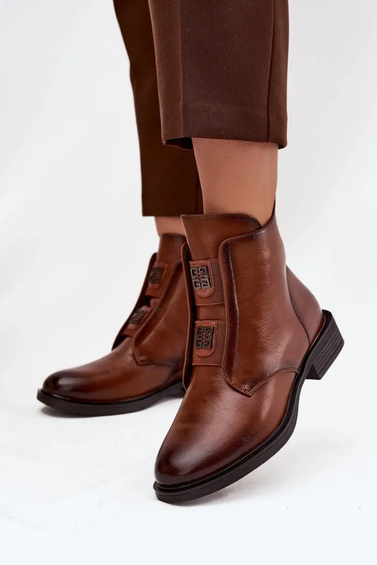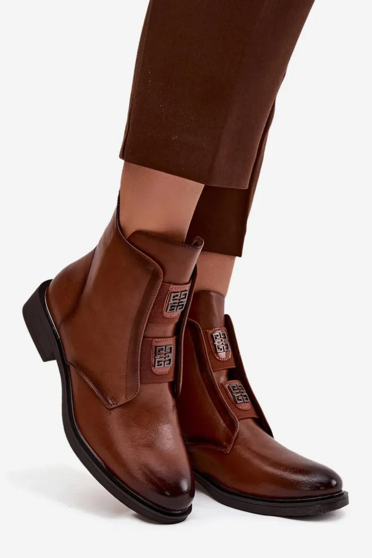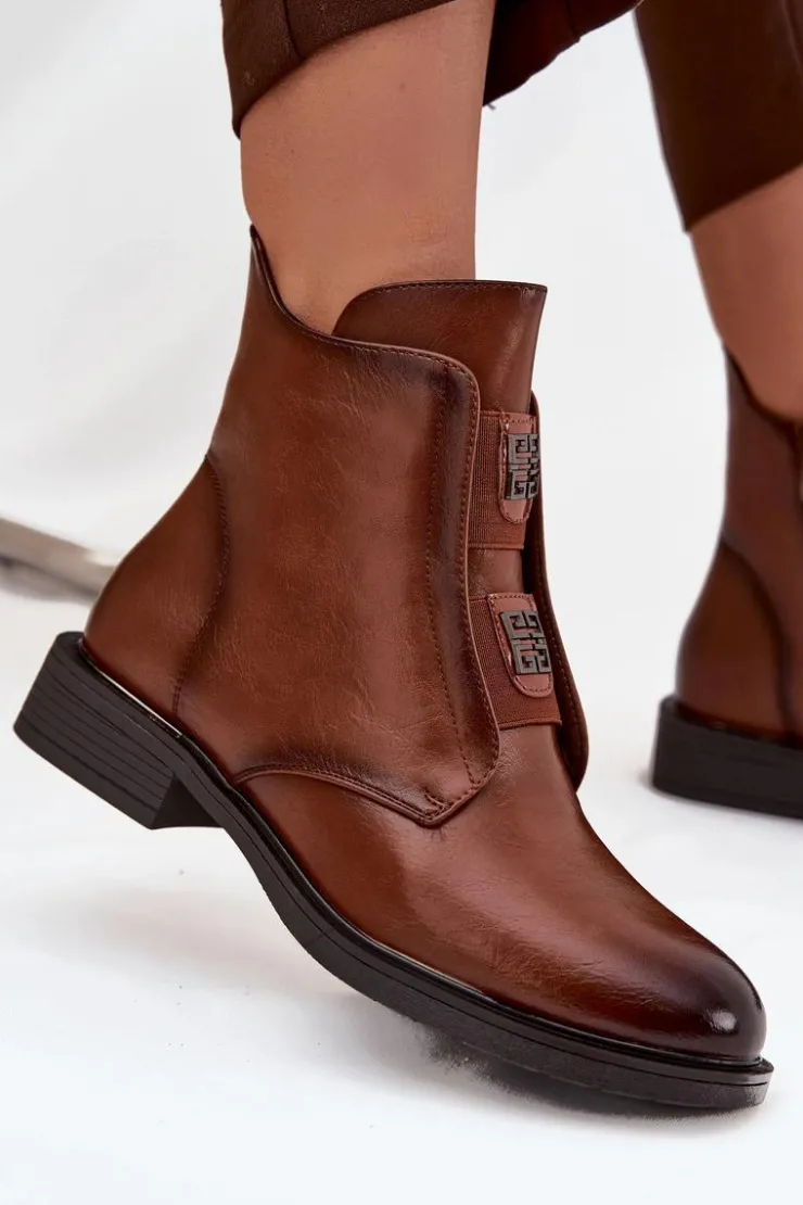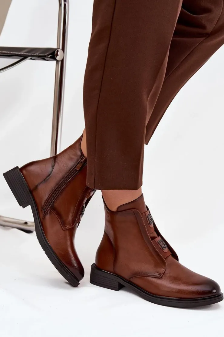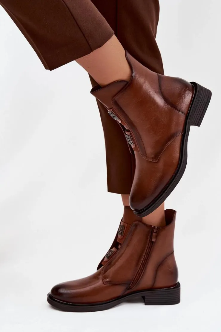 Botki damskie z eko skóry to wygodne i stylowe obuwie na chłodniejsze dni. Osadzone na niskim obcasie, zapewniają komfort podczas codziennego noszenia. Model zapinany na zamek jest praktyczny, a ocieplenie kocem obuwniczym gwarantuje ciepło i wygodę. Z przodu buty zdobią dwa ozdobne detale, które nadają im eleganckiego charakteru. Przy wyborze rozmiaru prosimy sugerować się tabelą rozmiarów.