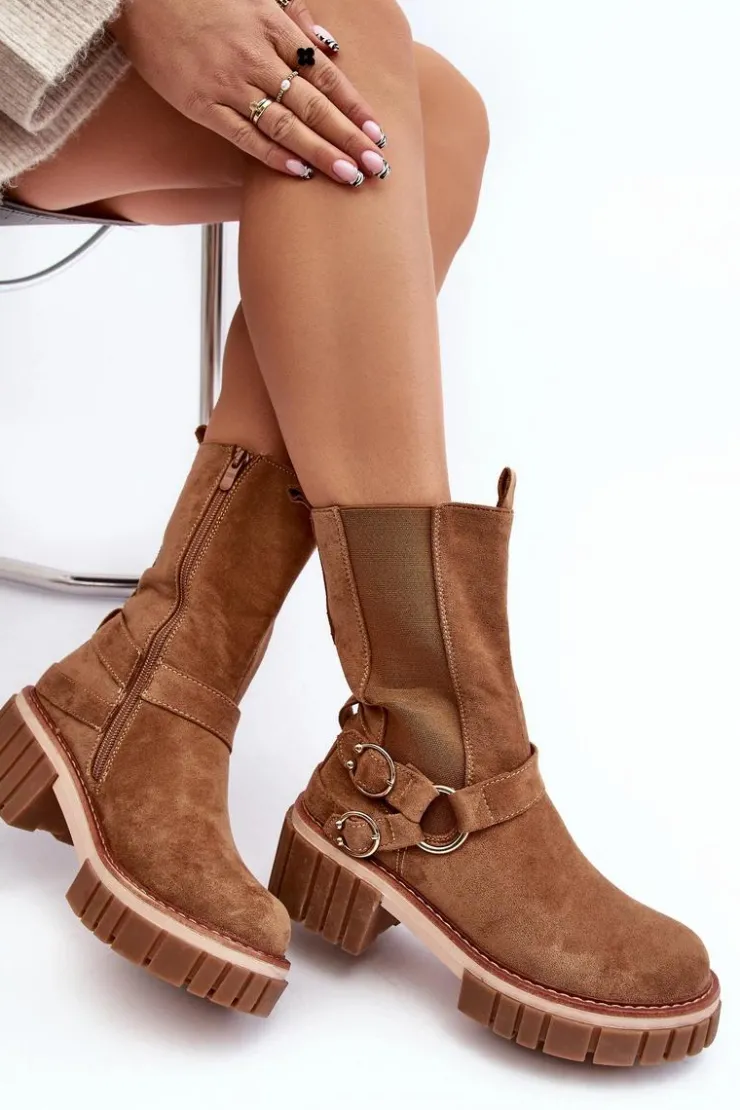 Wyjątkowe, damskie botki z wyższą cholewką wykonaną z eko zamszu. Zostały przyozdobione z boku paskami z klamrami. Zapinane na zamek błyskawiczny. Osadzone na masywnym, płaskim obcasie i platformie ze żłobieniami po bokach. Botki te posiadają w środku ocieplenie w postaci miłego w dotyku, delikatnego futerka. Świetny model do wielu stylizacji! Przy wyborze rozmiaru prosimy sugerować się tabelą rozmiarów.