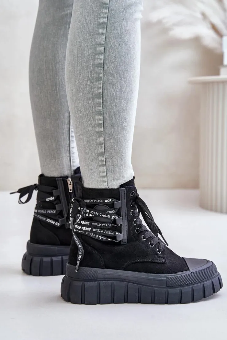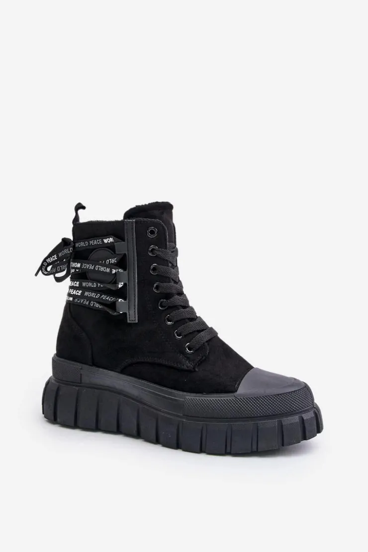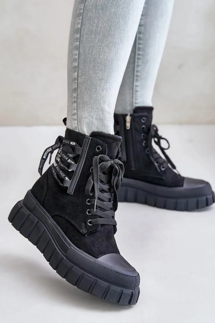 Botki damskie wykonane z eko zamszu. Zapinane na zamek oraz sznurowane. Osadzone na platformie, która doskonale odizoluje od zimnego podłoża. Noski zaokrąglone. W środku ocieplenie w postaci koca obuwniczego. Model ten wyróżnia się dodatkowym ozdobnym sznurowaniem z tyłu. Koniecznie powinnaś je mieć! Przy wyborze rozmiaru prosimy sugerować się tabelą rozmiarów.