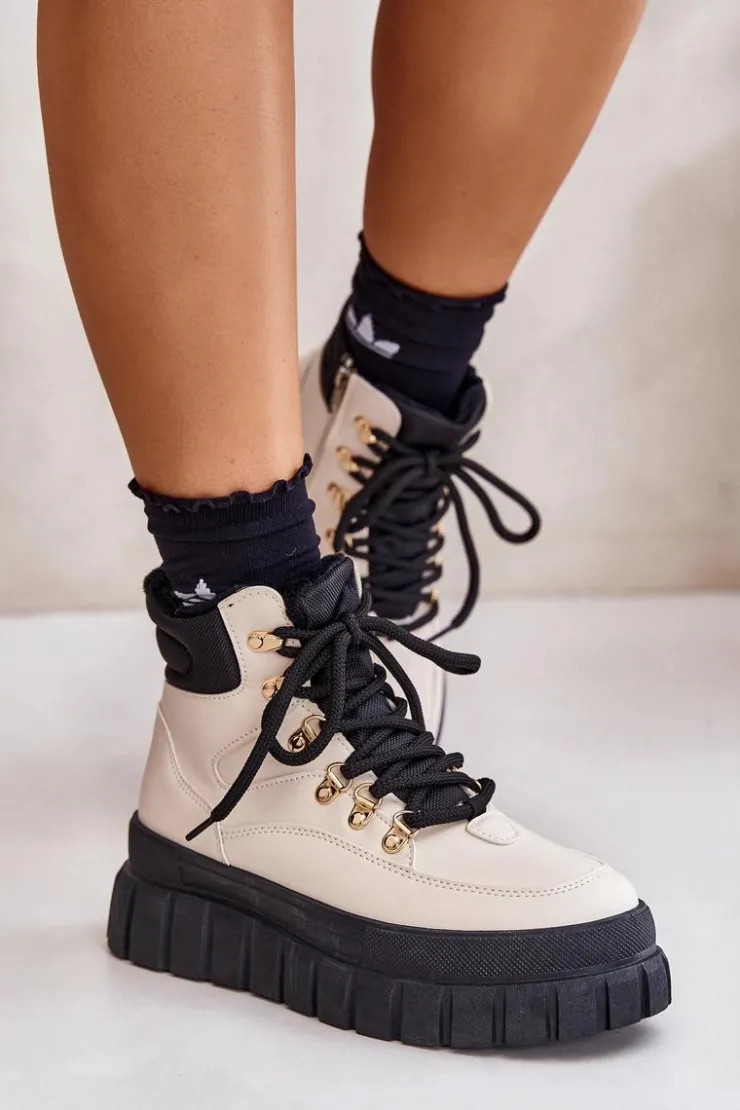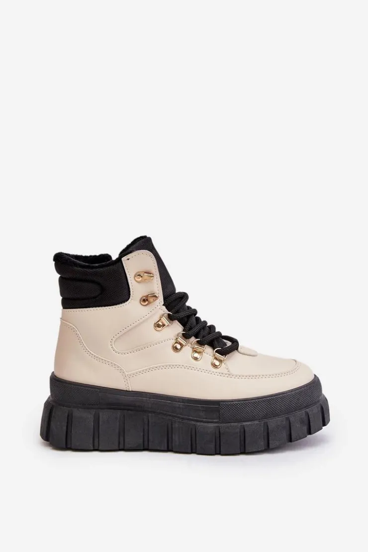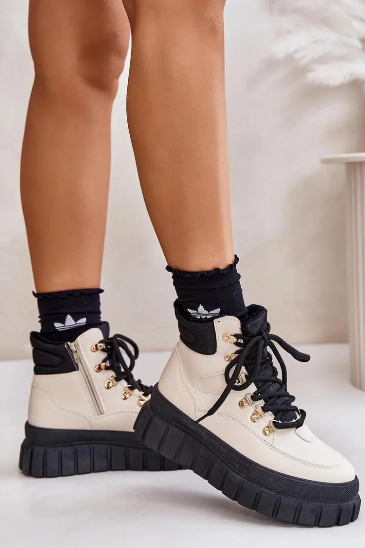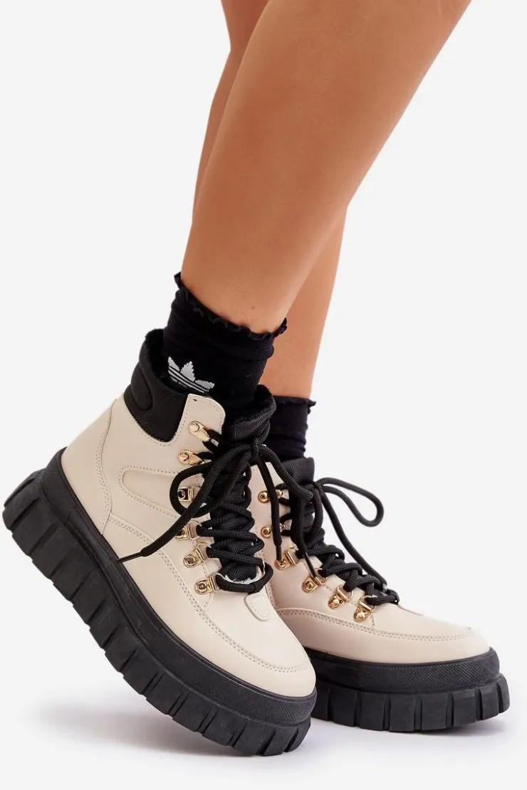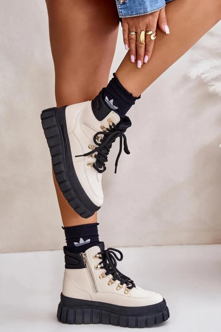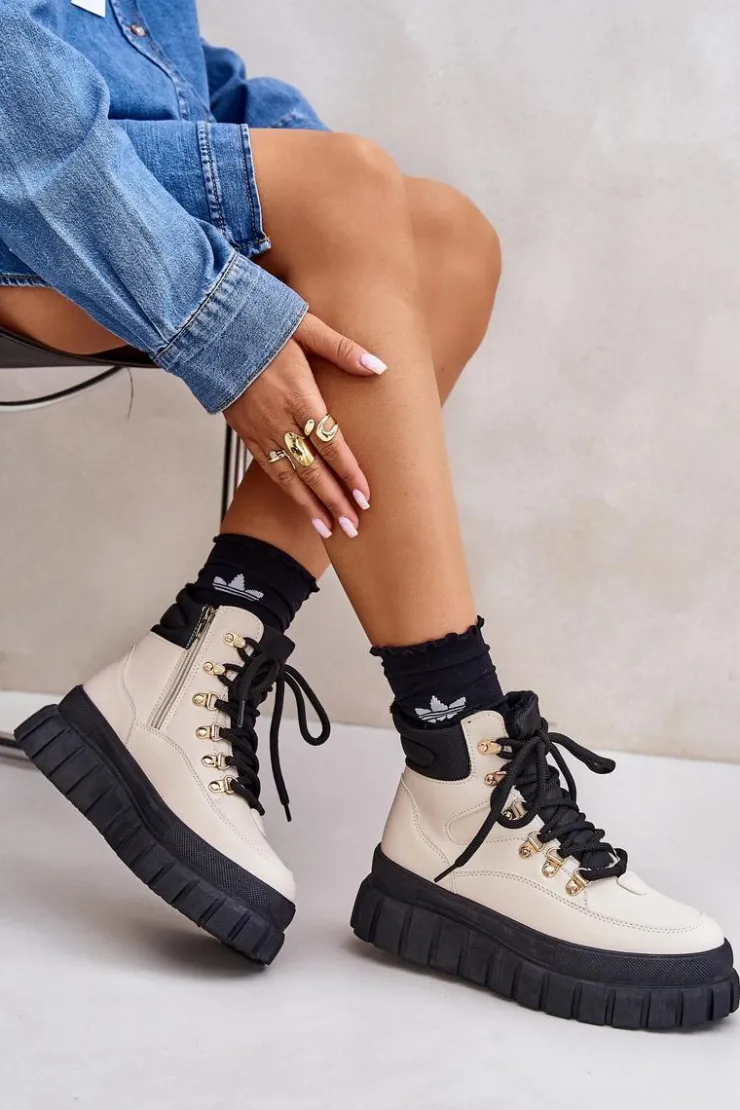 Damskie botki wykonane z eko skóry Osadzone na masywnej platformie, która doskonale odizoluje od zimnego podłoża. Model ten posiada sznurowanie oraz dodatkowe zapięcie na zamek. Ocieplenie w postaci koca obuwniczego zapewni komfort i ciepło. To obuwie, które nie tylko jest stylowe, ale również funkcjonalne. Idealne dla kobiet, które cenią sobie wygodę i modny wygląd. Przy wyborze rozmiaru prosimy sugerować się tabelą rozmiarów.