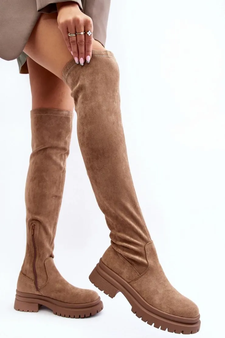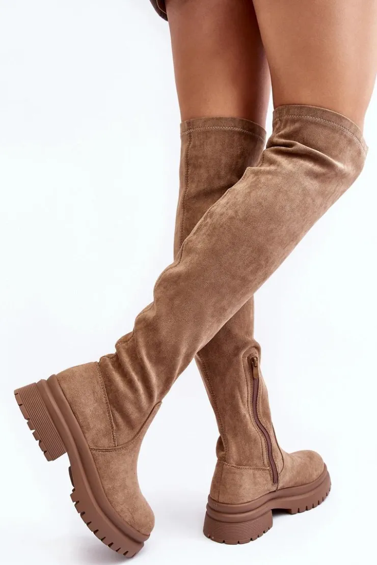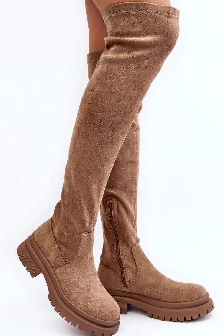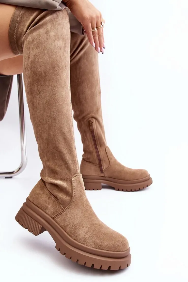 Damskie kozaki z cholewką za kolano. Wykonane z eko zamszu. Osadzone na masywnej podeszwie i płaskim obcasie. Noski zaokrąglone. Usztywniony zapiętek. Wkładka lekko ocieplona kocem obuwniczym. Klasyczny fason sprawdzi się do wielu jesienno-zimowych stylizacji! Przy wyborze rozmiaru prosimy kierować tabelą rozmiarów.