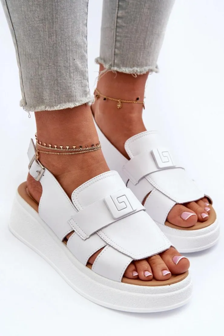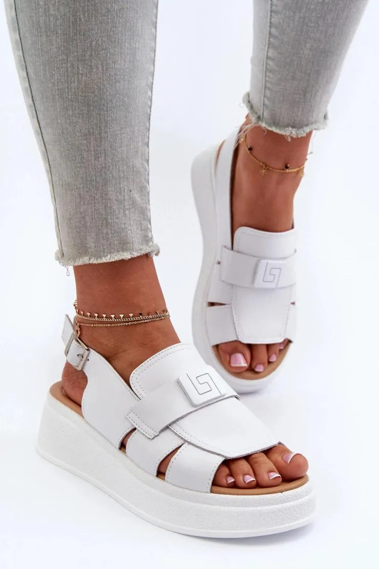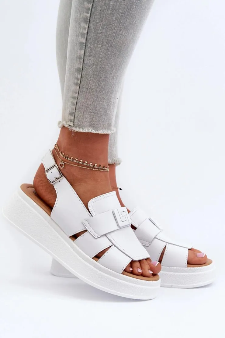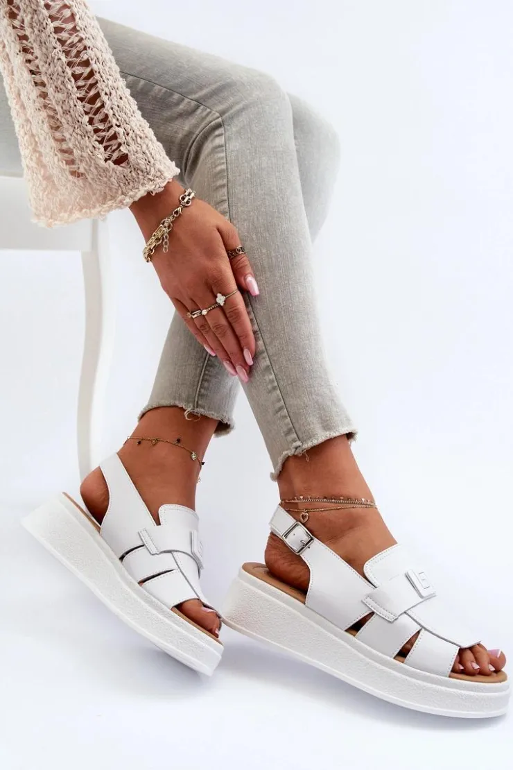 Skórzane sandały damskie na platformie i lekkim koturnie są zarówno stylowe, jak i wygodne. Zapinane na regulowany pasek ze sprzączką, zapewniają idealne dopasowanie do stopy. Delikatna ozdoba na pasku dodaje im uroku, podkreślając ich elegancję. Idealne na letnie dni, gwarantują stabilność i komfort przez cały dzień. Przy wyborze rozmiaru prosimy sugerować się tabelą rozmiarów.