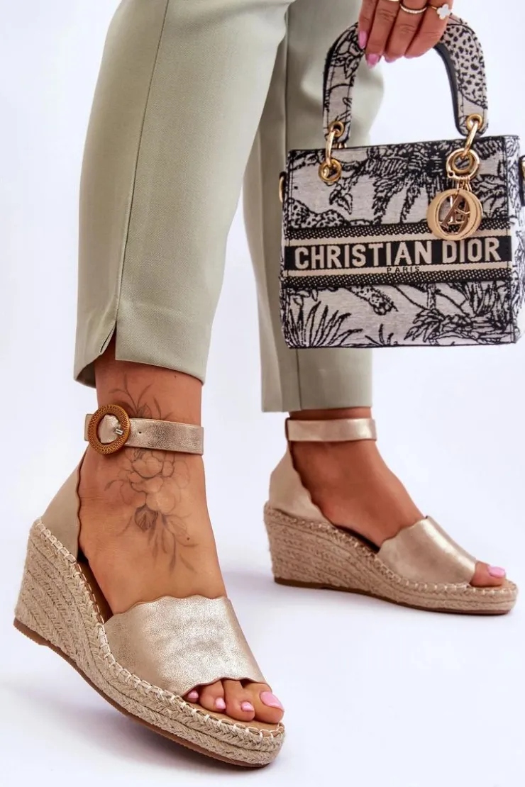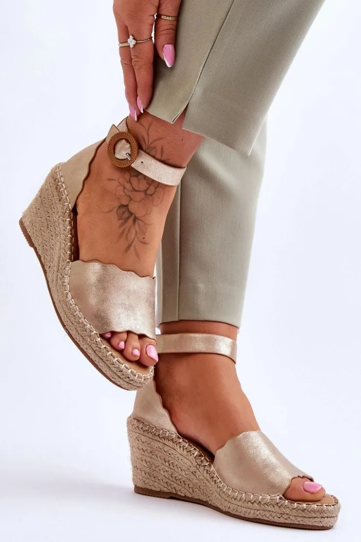 Damskie sandałki osadzone na platformie i koturnie. Dodatkowo zostały ozdobione jutową plecionką. Wykonane z wysokiej jakości eko skóry. Sandałki posiadają ozdobne wykończenie cholewki w postaci falbanki. Model ten jest zapinany na regulowany pasek ze sprzączką. Miękka wkładka typu Comfort z efektem poduszki jest niezwykle wygodna podczas użytkowania. Przy wyborze rozmiaru prosimy sugerować się tabelą rozmiarów.