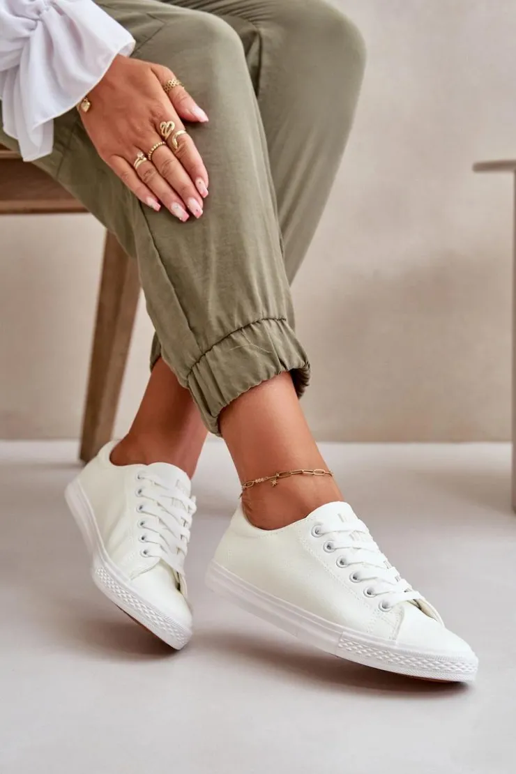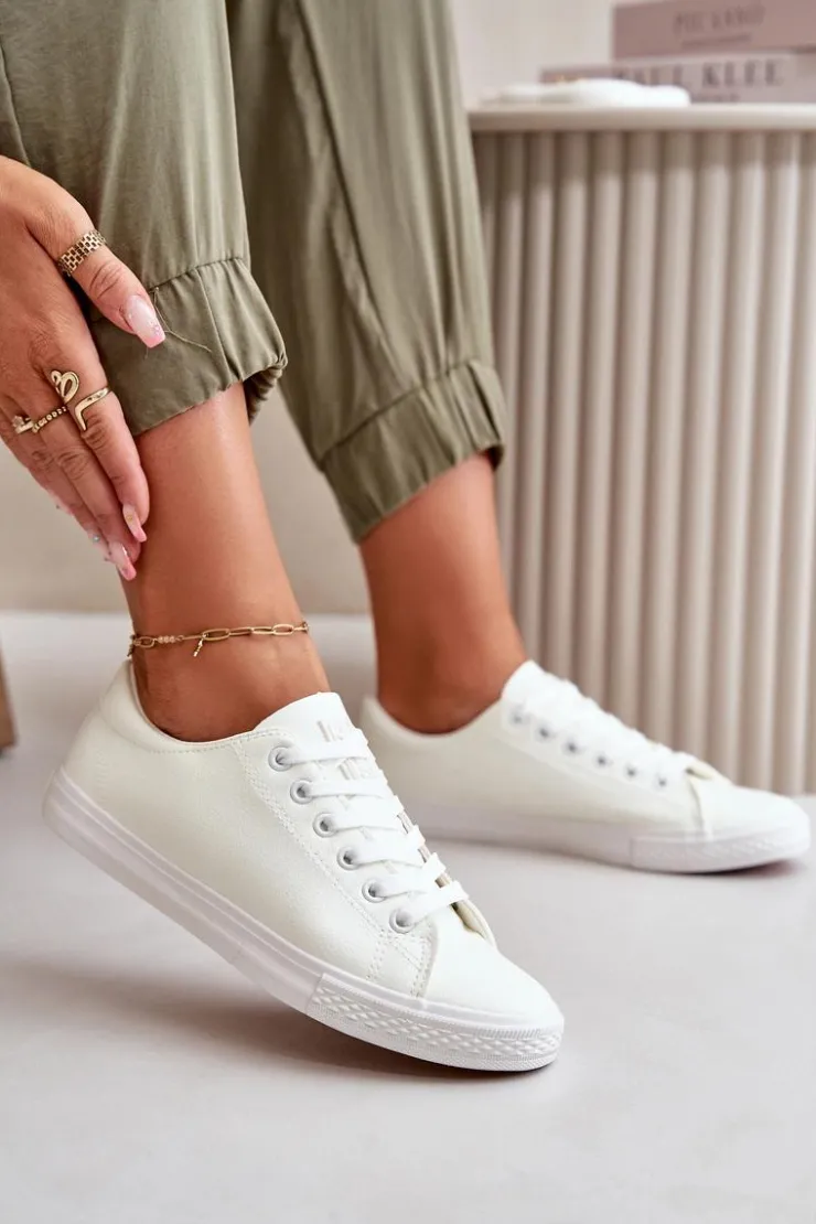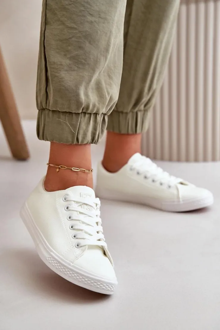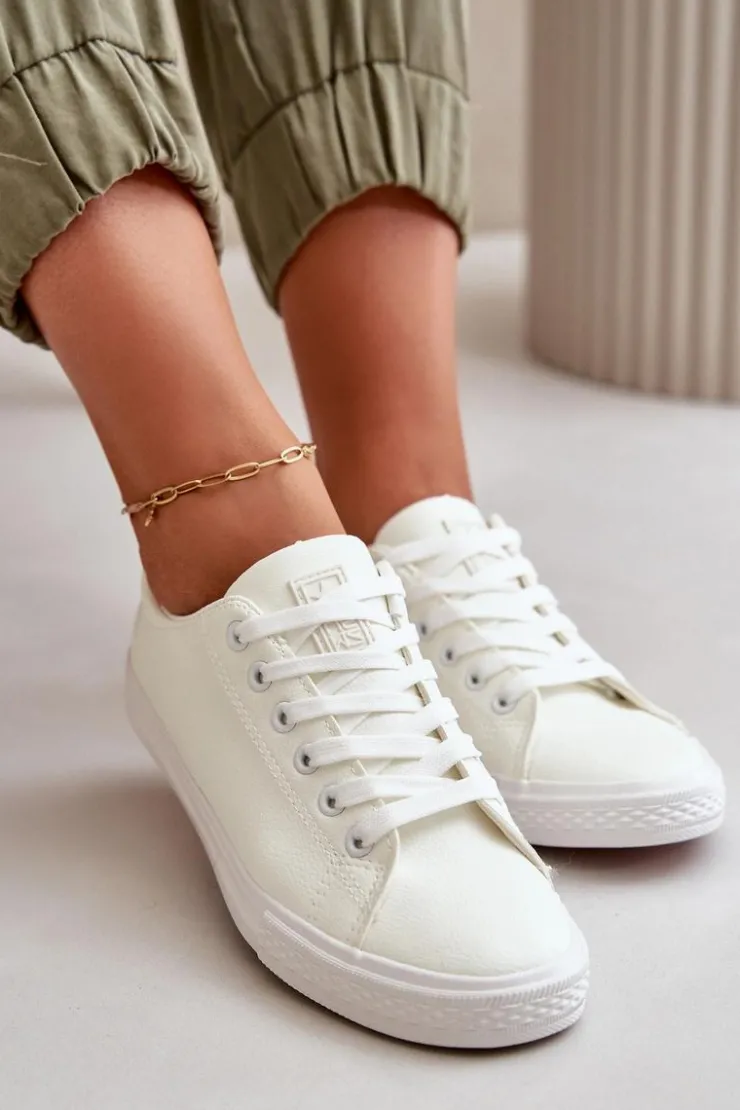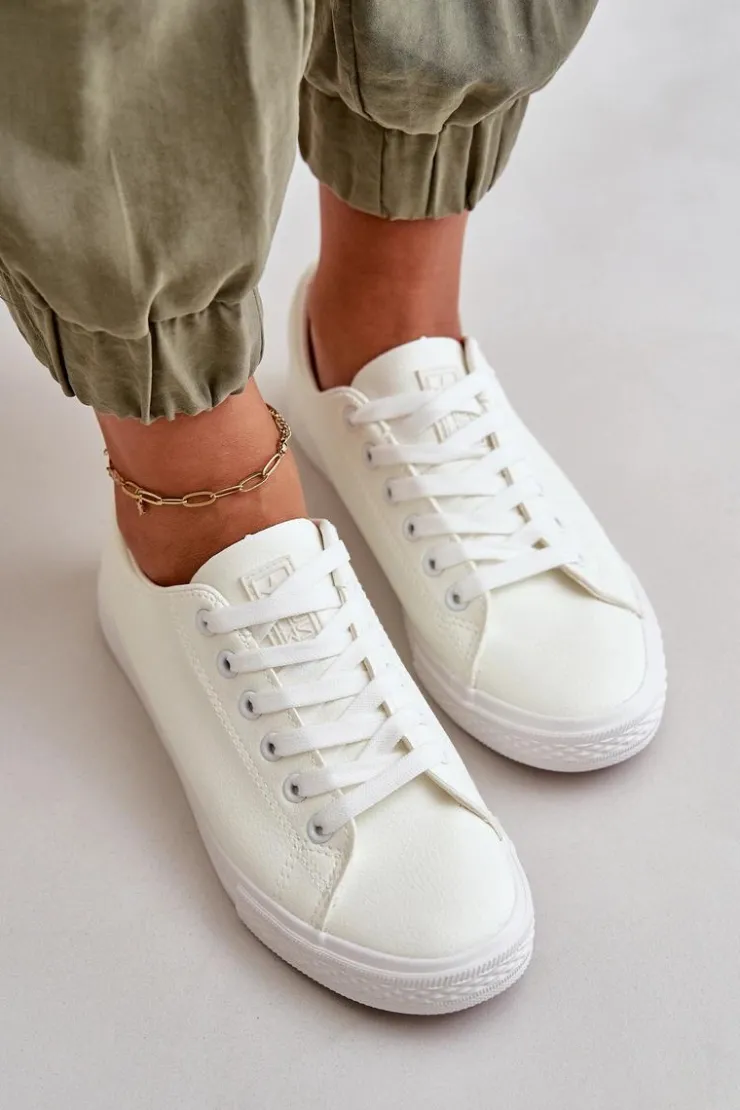 Klasyczne trampki damskie wykonane z eko skóry z cholewką do kostki. Buty posiadają gumową podeszwę, która jest dodatkowo antypoślizgowa. Ponadczasowy model, który powinnaś mieć w swojej szafie! Nosek zaokrąglony. Wygodna, materiałowa wkładka zapewni komfort podczas użytkowania. Model klasycznie wiązany na płaskie sznurowadła. Przy wyborze rozmiaru prosimy sugerować się tabelą rozmiarów.