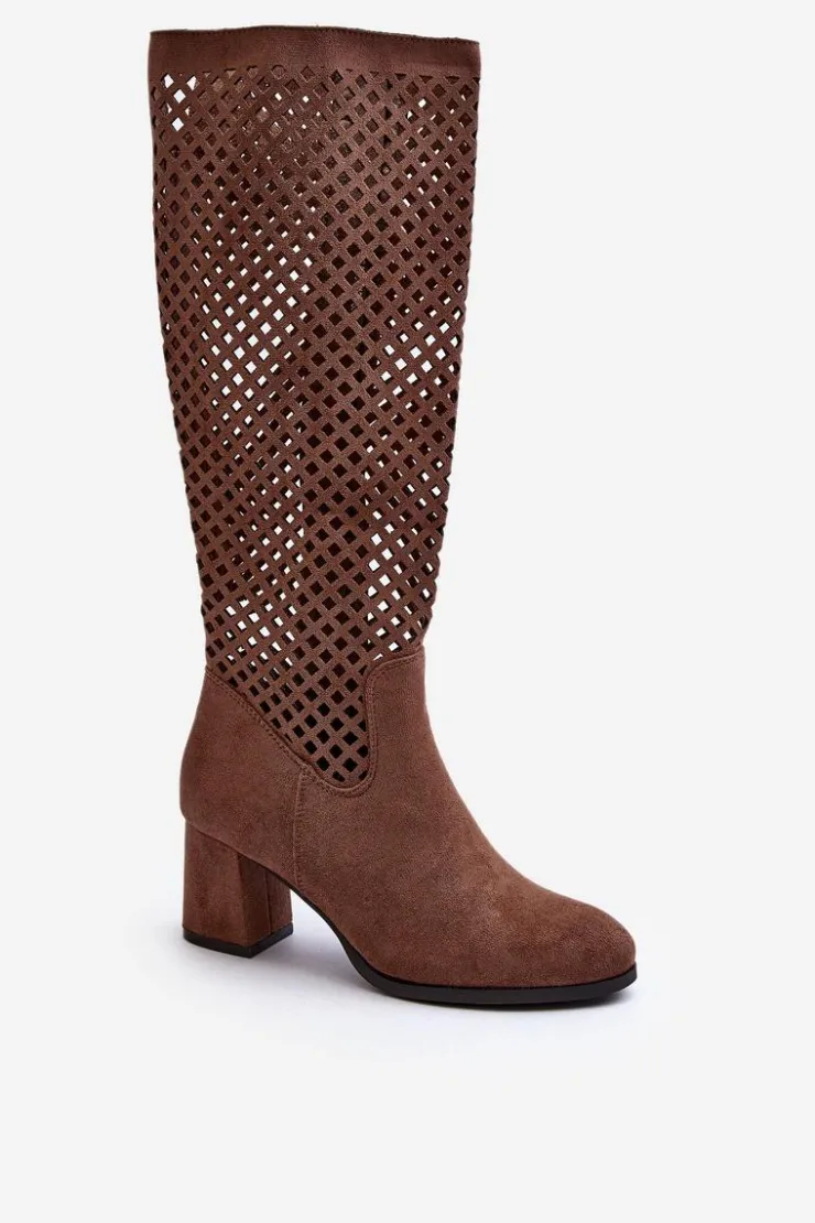Damskie kozaki marki Jezzi. Wykonane z wysokiej jakości eko zamszu, prezentują się niezwykle elegancko. Ich ażurowy wzór dodaje im subtelnego uroku. Obcas niski słupek gwarantuje zarówno stabilność, jak i wygodę, pozwalając Ci cieszyć się pewnością kroku przez cały dzień. Usztywniony zapiętek dodaje dodatkowego wsparcia i komfortu dla Twojej stopy, co jest istotne, szczególnie podczas dłuższych spacerów. Przy wyborze rozmiaru prosimy sugerować się tabelą rozmiarów.