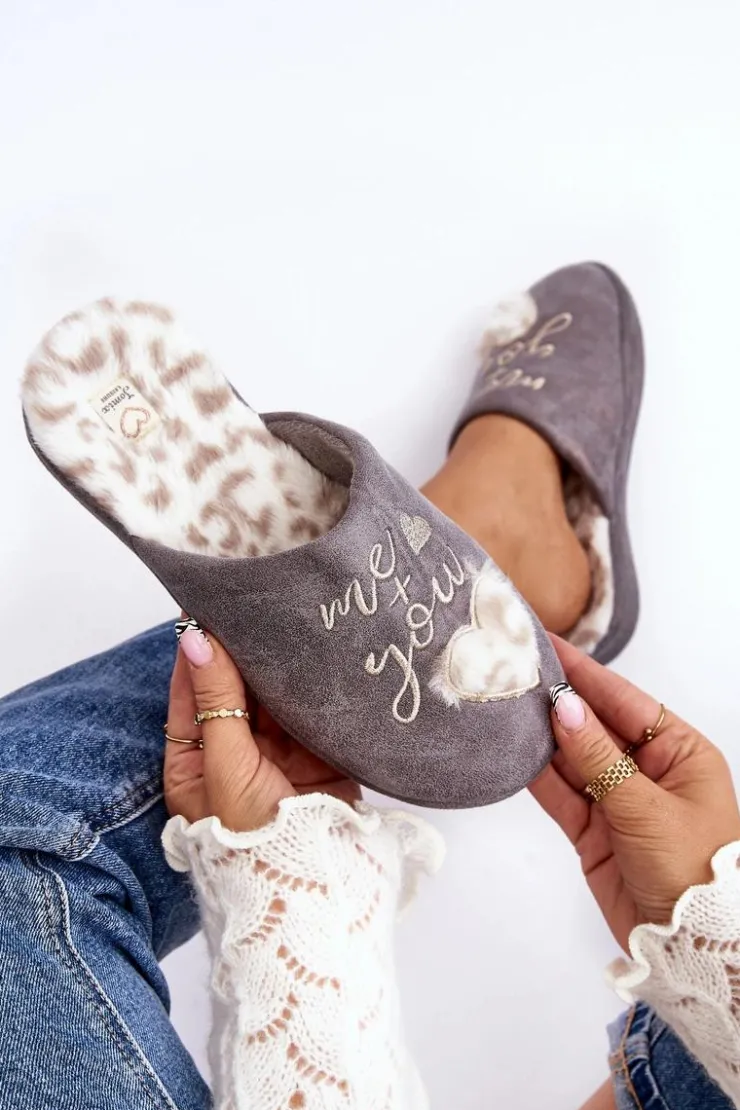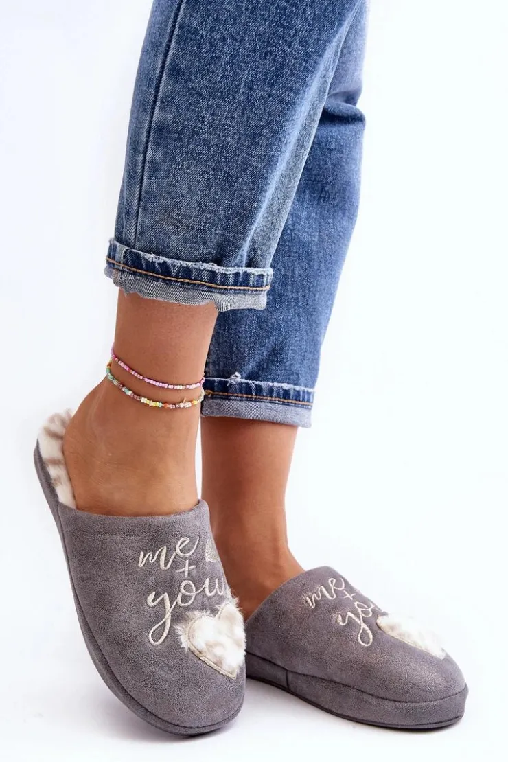 Błyszczące kapcie damskie ozdobione napisem i sercem. Model wsuwany z zakrytym noskiem. Osadzone na grubej podeszwie. Wkładka ocieplona futerkiem. Przy wyborze rozmiaru prosimy kierować tabelą rozmiarów.