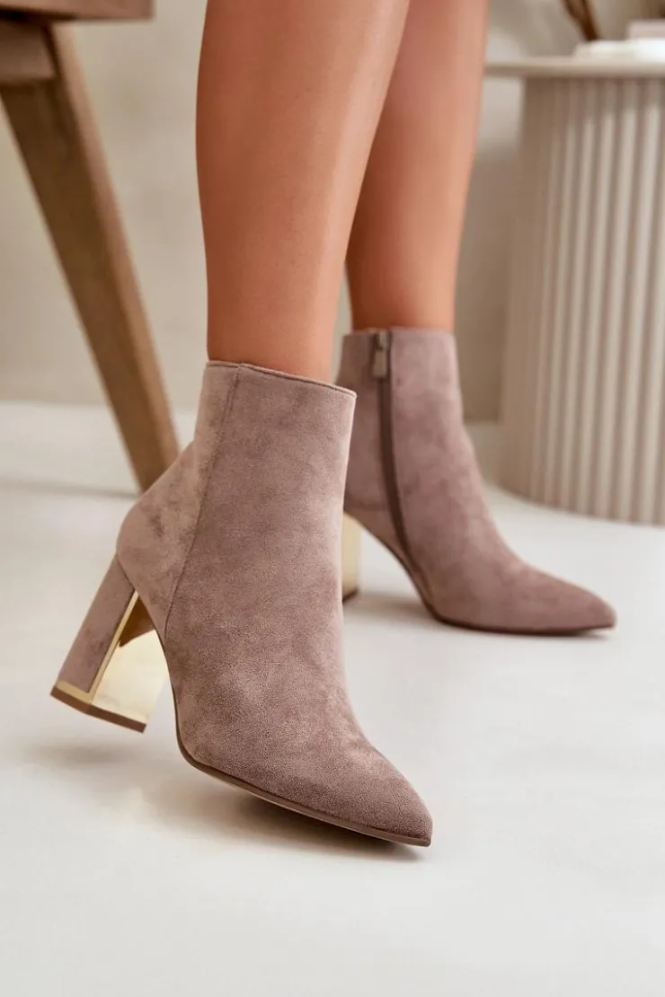 Damskie botki wykonane z eko zamszu, który jest przyjemny w dotyku i dodaje im eleganckiego wyglądu. Wnętrze botków jest ocieplane, co zapewnia ciepło i komfort w chłodniejsze dni. Noski w szpic nadają im stylowego charakteru, a obcas w formie stabilnego słupka jest dodatkowo ozdobiony lustrzanym elementem, co dodaje botkom wyjątkowego blasku i modnego akcentu. Koniecznie powinnaś je mieć w swojej jesienno-zimowej garderobie! Przy wyborze rozmiaru prosimy sugerować się tabelą rozmiarów.
