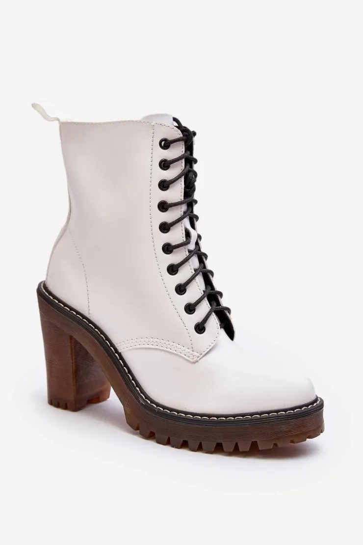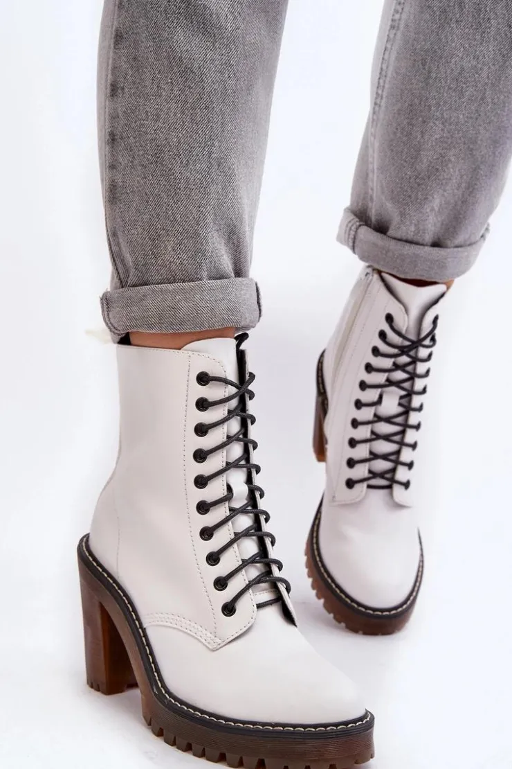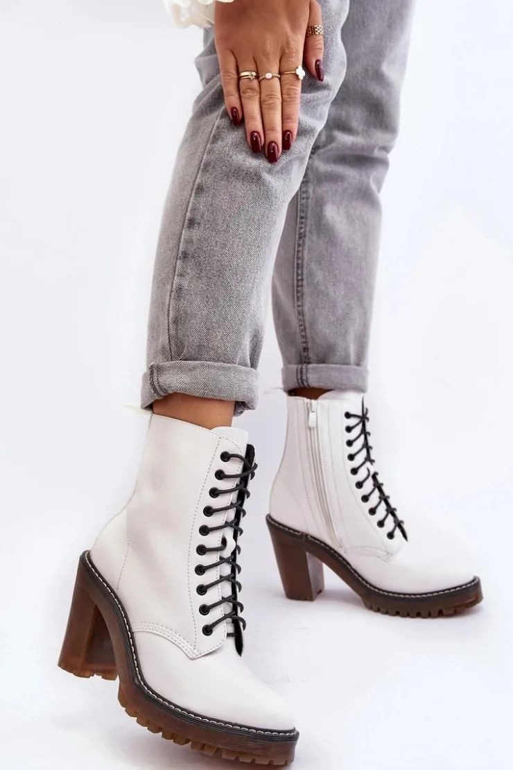 Botki damskie wykonane z eko skóry. Osadzone na obcasie w postaci słupka. Cholewka za kostkę. Model zapinany na suwak z boku oraz dodatkowo posiada sznurowanie. Wkładka ocieplona kocem obuwniczym. Noski zaokrąglone. Usztywniony zapiętek. Przy wyborze rozmiaru prosimy sugerować się tabelą rozmiarów.