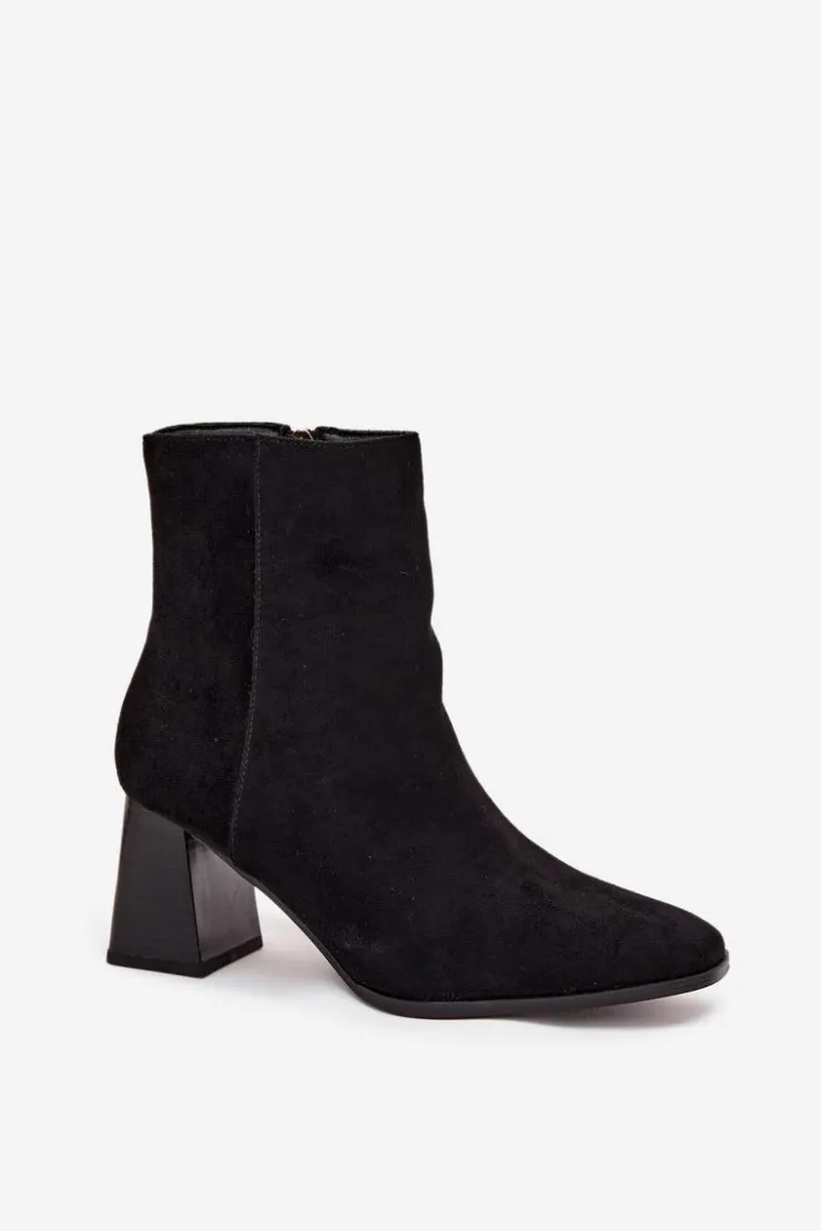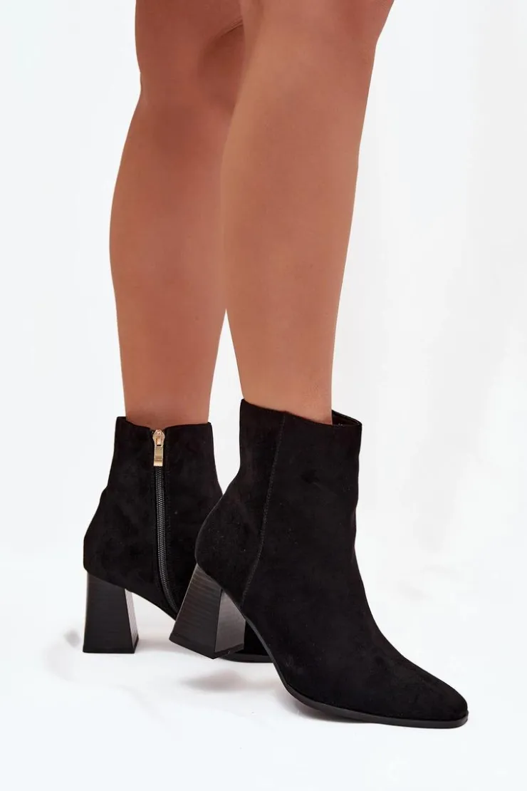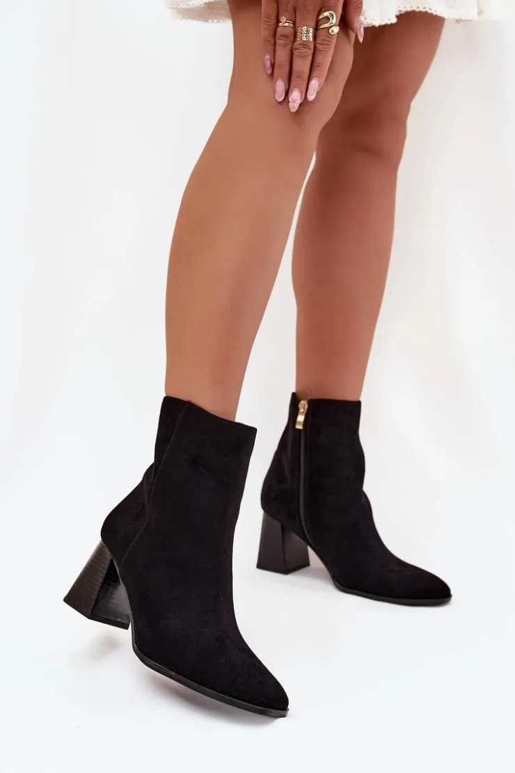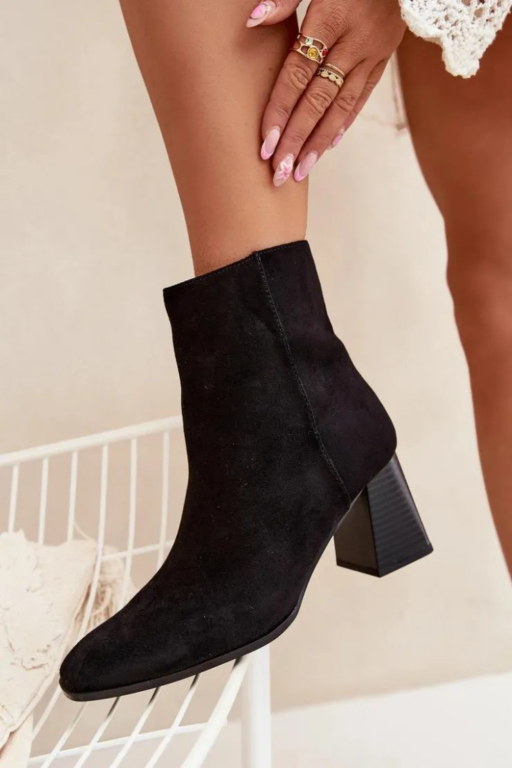 Botki damskie z eko zamszu, osadzone na obcasie w formie słupka, to elegancka propozycja na chłodniejsze dni. Zapinane na zamek, zapewniają łatwość zakładania i idealne dopasowanie do stopy. Noski są delikatnie zaokrąglone, co dodaje im subtelności i komfortu. Idealne do codziennych stylizacji, świetnie komponują się z sukienkami, spódnicami czy spodniami, łącząc styl z wygodą. Przy wyborze rozmiaru prosimy sugerować się tabelą rozmiarów.