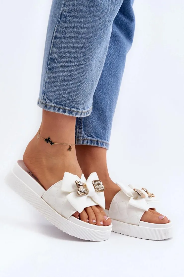 Damskie klapki wykonane z eko skóry. Osadzone na masywnej platformie. Model ten posiada materiałową kokardę i imitację agrafki z misiem i blaszką z napisem. Idealne klapki na nadchodzący sezon! Koniecznie powinnaś je mieć! Przy wyborze rozmiaru prosimy sugerować się tabelą rozmiarów.