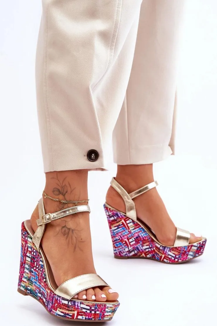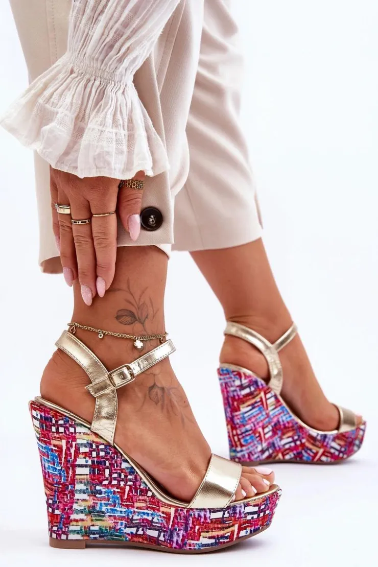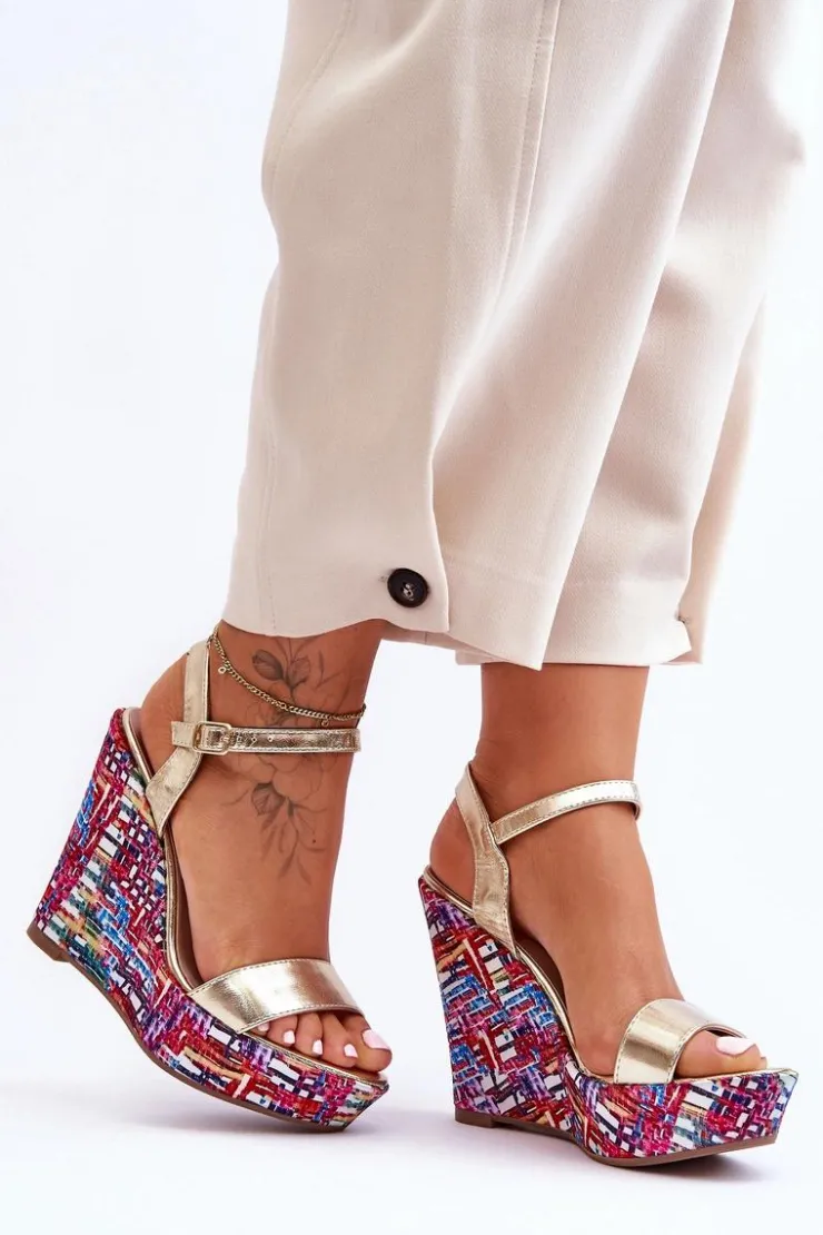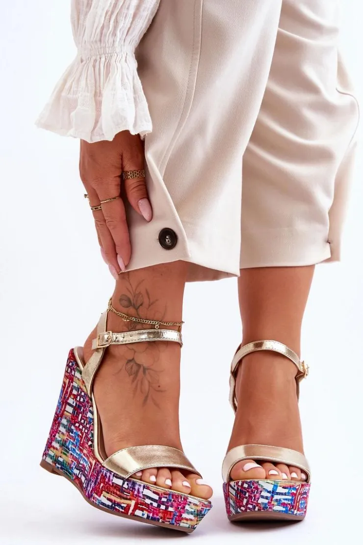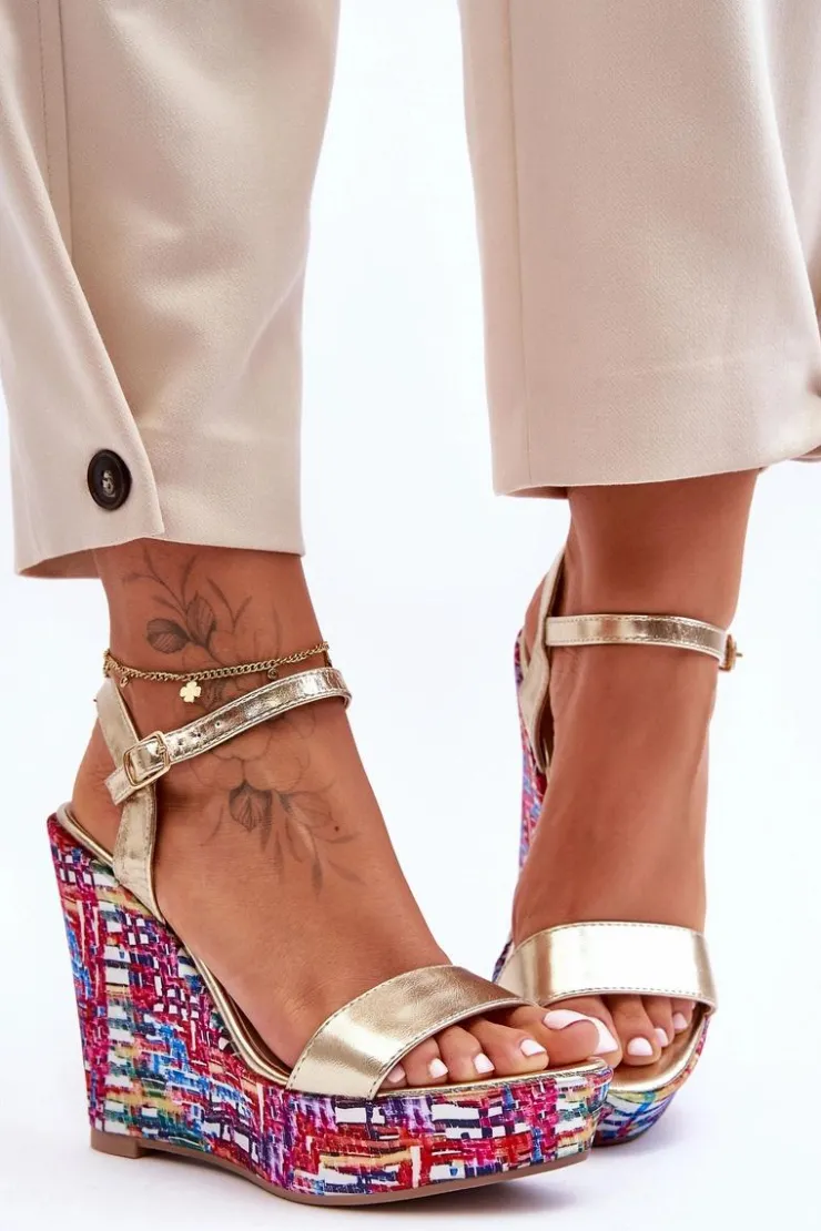 Hot Boto Damskie Sandałki Na Kolorowym Koturnie Złote Malibu