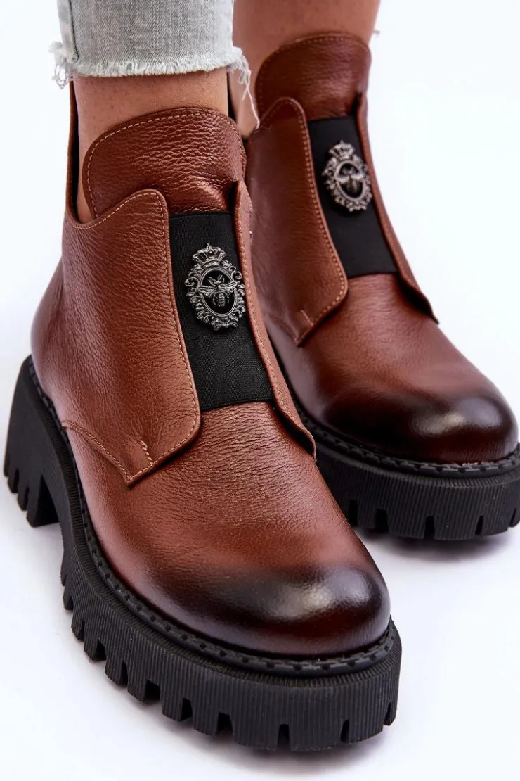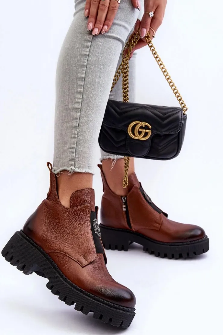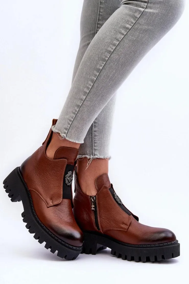 Damskie botki zostały wykonane z wysokiej jakości naturalnej skóry. Osadzone na masywnym obcasie i platformie ze żłobieniami. Model zapinany na suwak po wewnętrznej stronie cholewki. Z przodu na elastycznej wstawce znajduje się ozdoba z tworzywa sztucznego. Wnętrze ocieplone kocem obuwniczym. Ten wyjątkowy model wzbogaci wiele Twoich stylizacji! Przy wyborze rozmiaru prosimy sugerować się tabelą rozmiarów.
