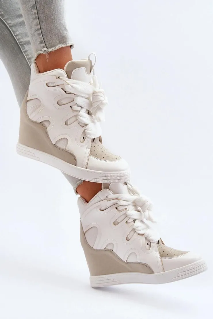 Sneakersy damskie wykonane z połączenia eko skóry i materiału tekstylnego. Osadzone na ukrytym koturnie, który delikatnie uniesie Twoją sylwetkę. Model ten posiada podwójne sznurowanie. Koniecznie powinnaś mieć ten fason w swojej garderobie, jeżeli cenisz sobie modny design! Przy wyborze rozmiaru prosimy kierować tabelą rozmiarów.
