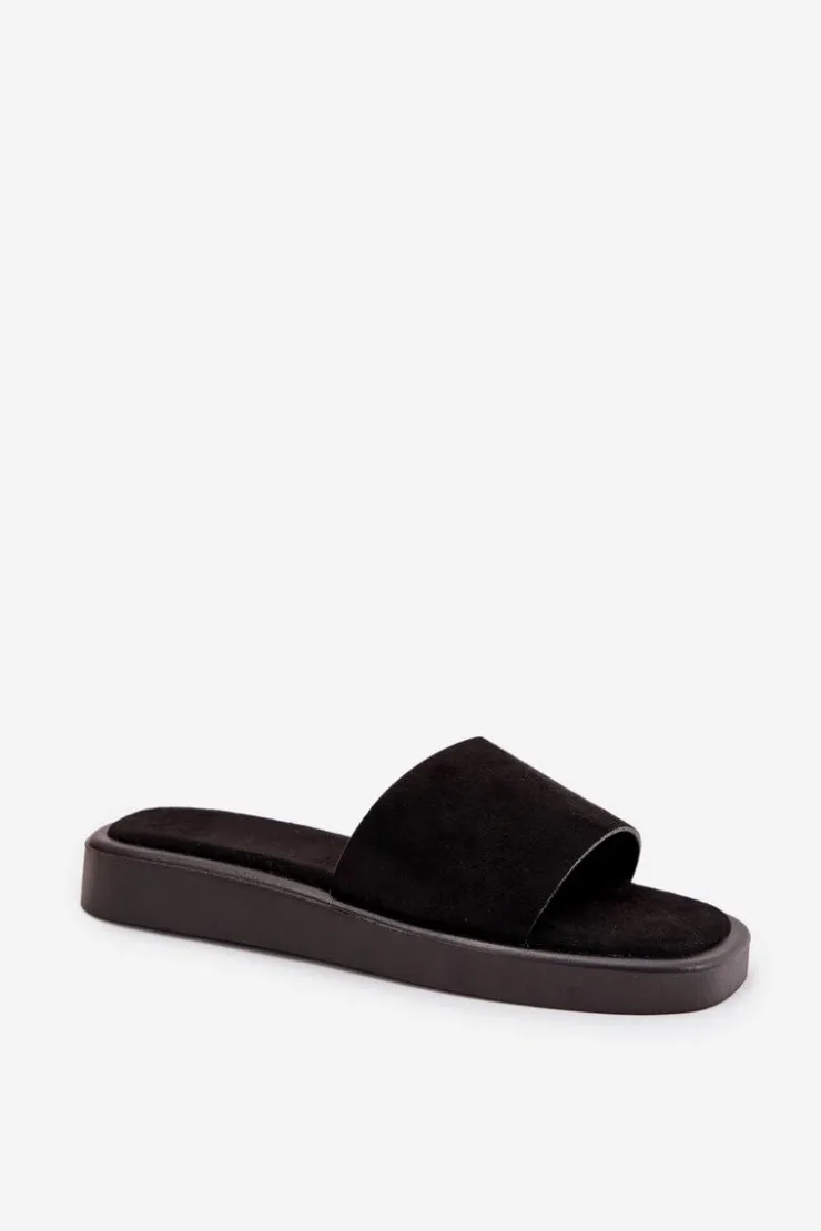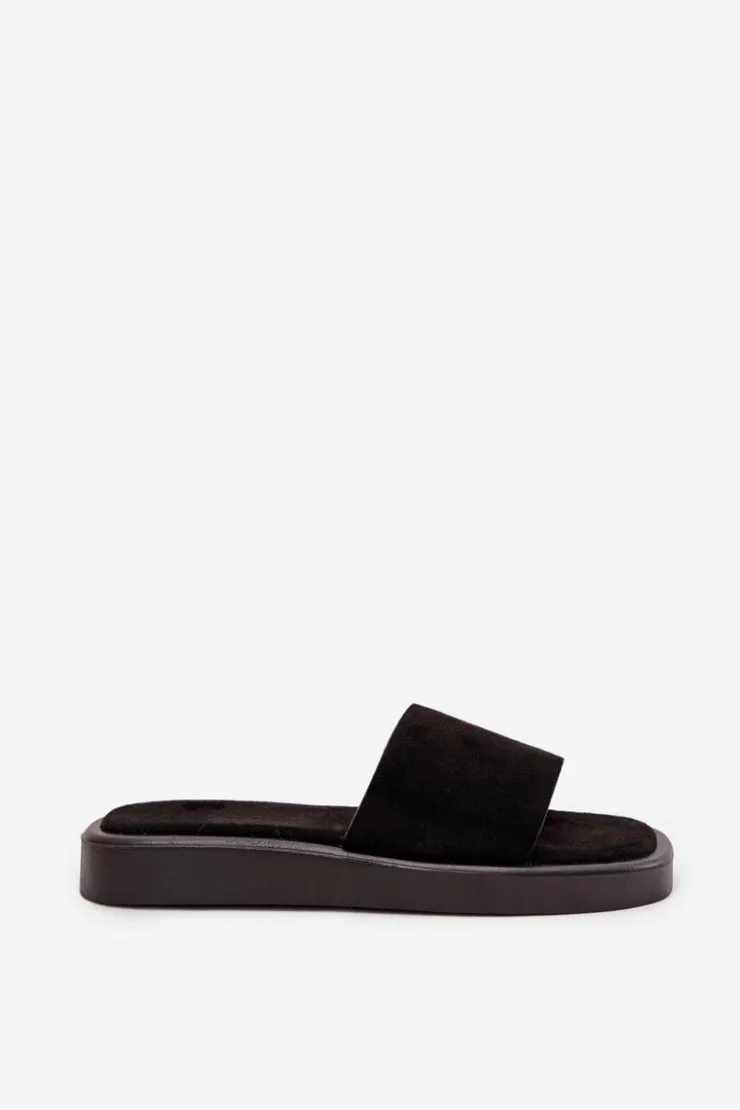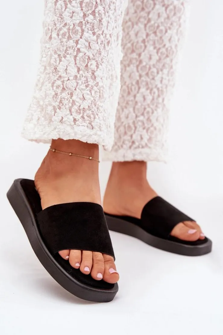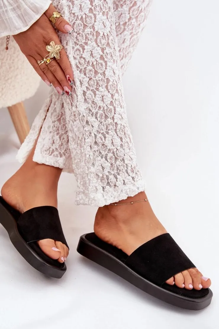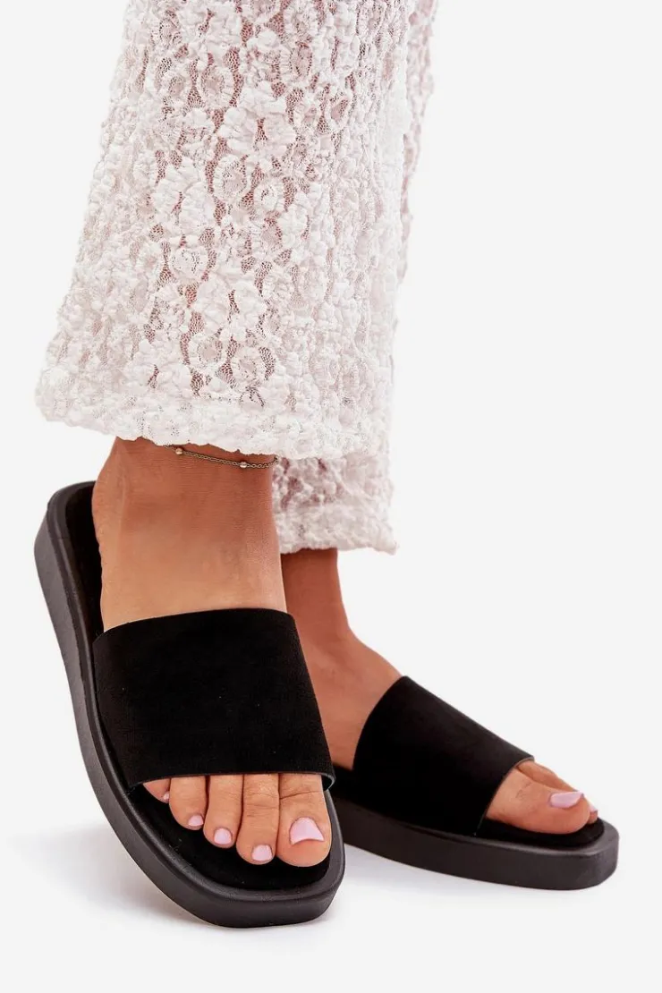 Klasyczne klapki damskie z eko zamszu, osadzone na platformie, łączą wygodę z prostym stylem. Idealne do casualowych stylizacji, doskonale komponują się z sukienkami, spódnicami czy spodniami, zapewniając komfort i elegancki wygląd na co dzień. Przy wyborze rozmiaru prosimy sugerować się tabelą rozmiarów.