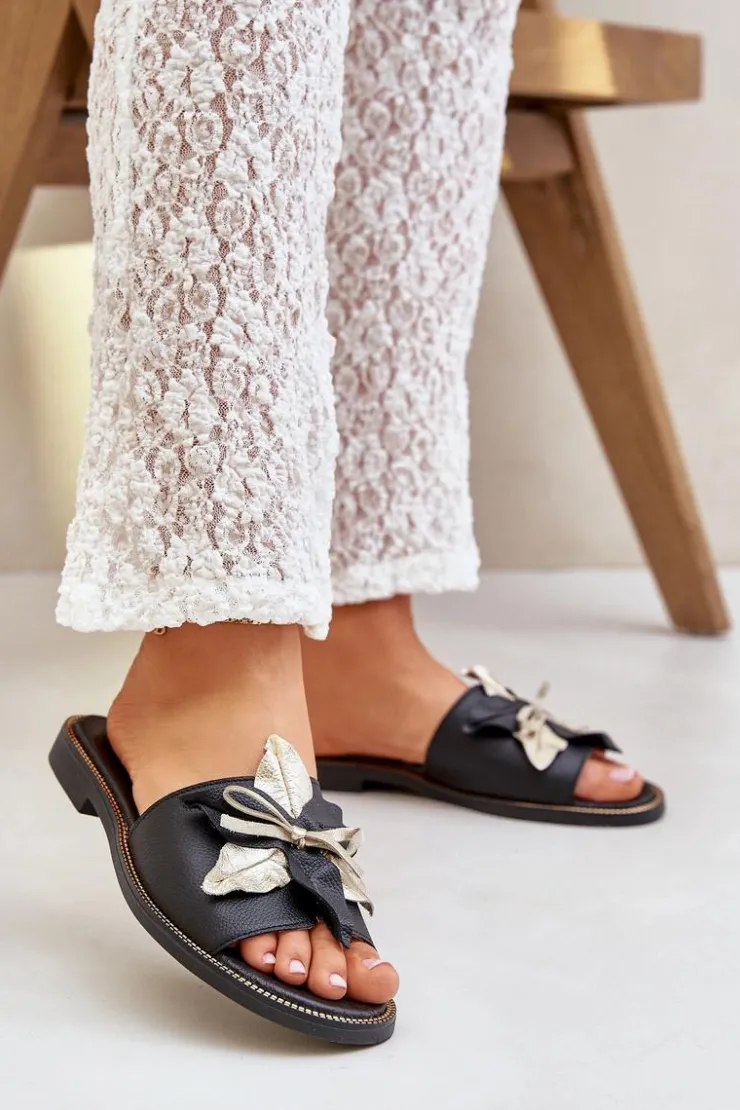 Damskie klapki ze skóry naturalnej stanowią znakomity wybór dla kobiet poszukujących połączenia elegancji z komfortem. Płaski obcas, zapewnia wygodę użytkowania przez cały dzień. Ozdoba nadaje im niepowtarzalny urok i elegancję. Model ten to idealny wybór zarówno do eleganckich stylizacji biurowych, jak i na codzienne wyjścia! Przy wyborze rozmiaru prosimy sugerować się tabelą rozmiarów.