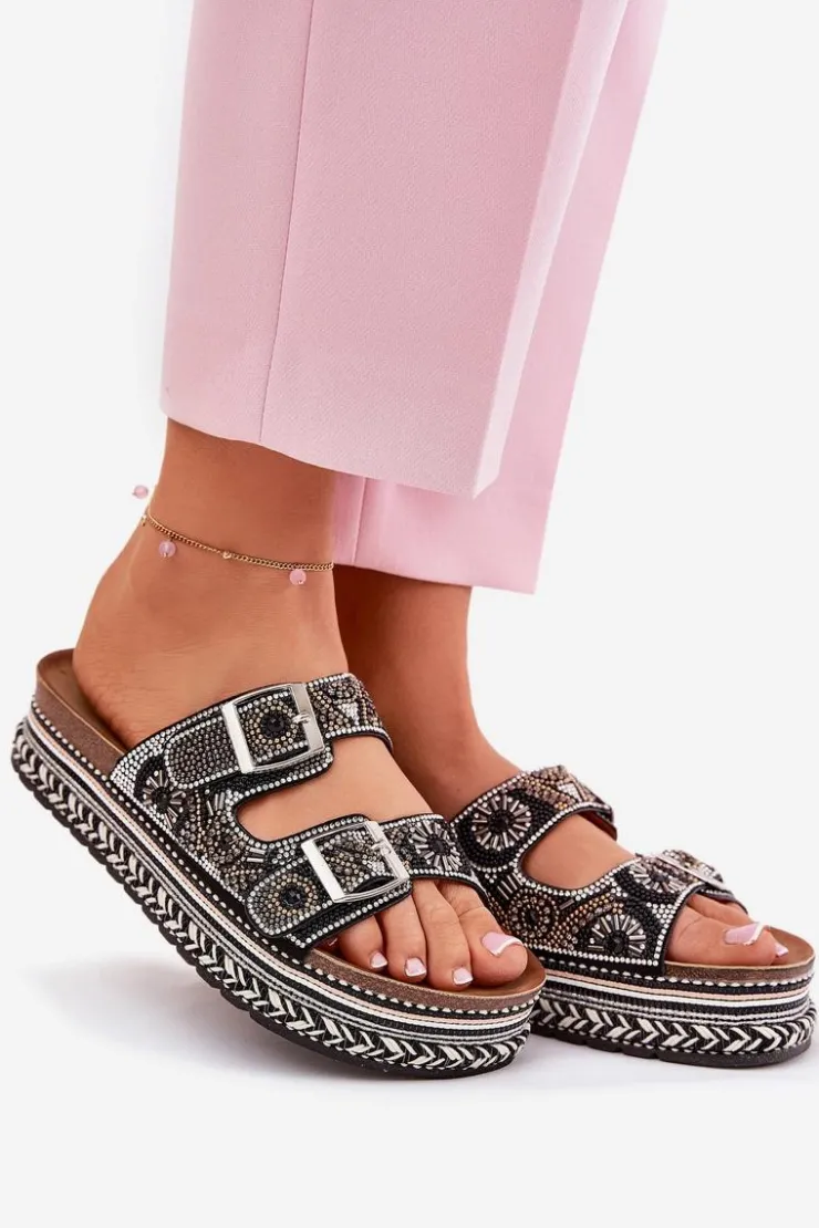 Stylowe klapki damskie na platformie, które wyróżniają się atrakcyjnym zdobieniem. Posiadają paski z klamrami, które dodają im nowoczesnego charakteru. Idealne na letnie dni, doskonale komponują się z sukienkami i spodniami, podkreślając każdą stylizację. Przy wyborze rozmiaru prosimy sugerować się tabelą rozmiarów.
