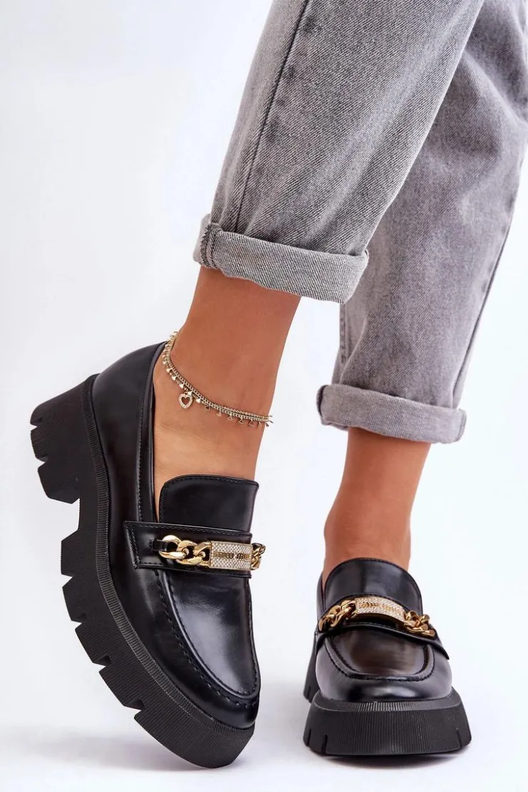 Te modne, damskie mokasyny świetnie sprawdzą się do wielu stylizacji! Osadzono je na masywnej platformie i płaskim obcasie. Mokasyny posiadają delikatnie usztywniany zapiętek oraz wkładkę z eko skóry. Na pasku z przodu znajduje się łańcuszek z ozdobną blaszką z dżetami. Koniecznie powinnaś mieć ten model! Przy wyborze rozmiaru prosimy sugerować się tabelą rozmiarów.