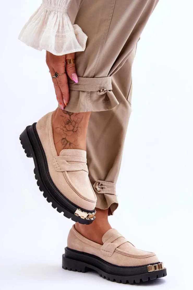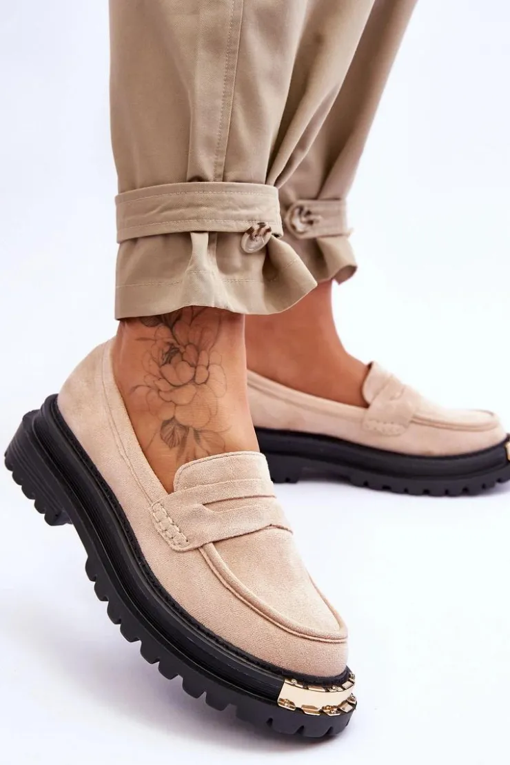 Klasyczne mokasyny zostały wykonane z ekologicznego zamszu. Na przodzie platformy posiadają ozdobne elementy. Osadzone na płaskim obcasie. Podeszwa z tworzywa sztucznego ze żłobieniami świetnie odizoluje od nierównego podłoża. Model wsuwany z usztywnianym zapiętkiem. Koniecznie powinnaś je mieć! Przy wyborze rozmiaru prosimy sugerować się tabelą rozmiarów.