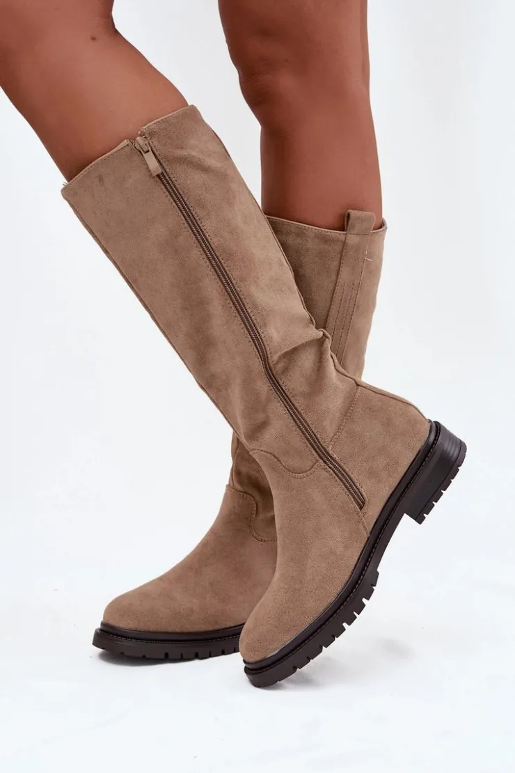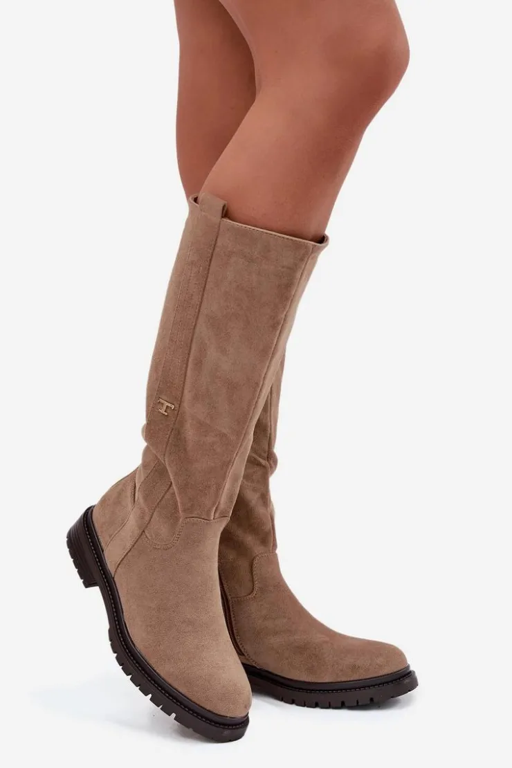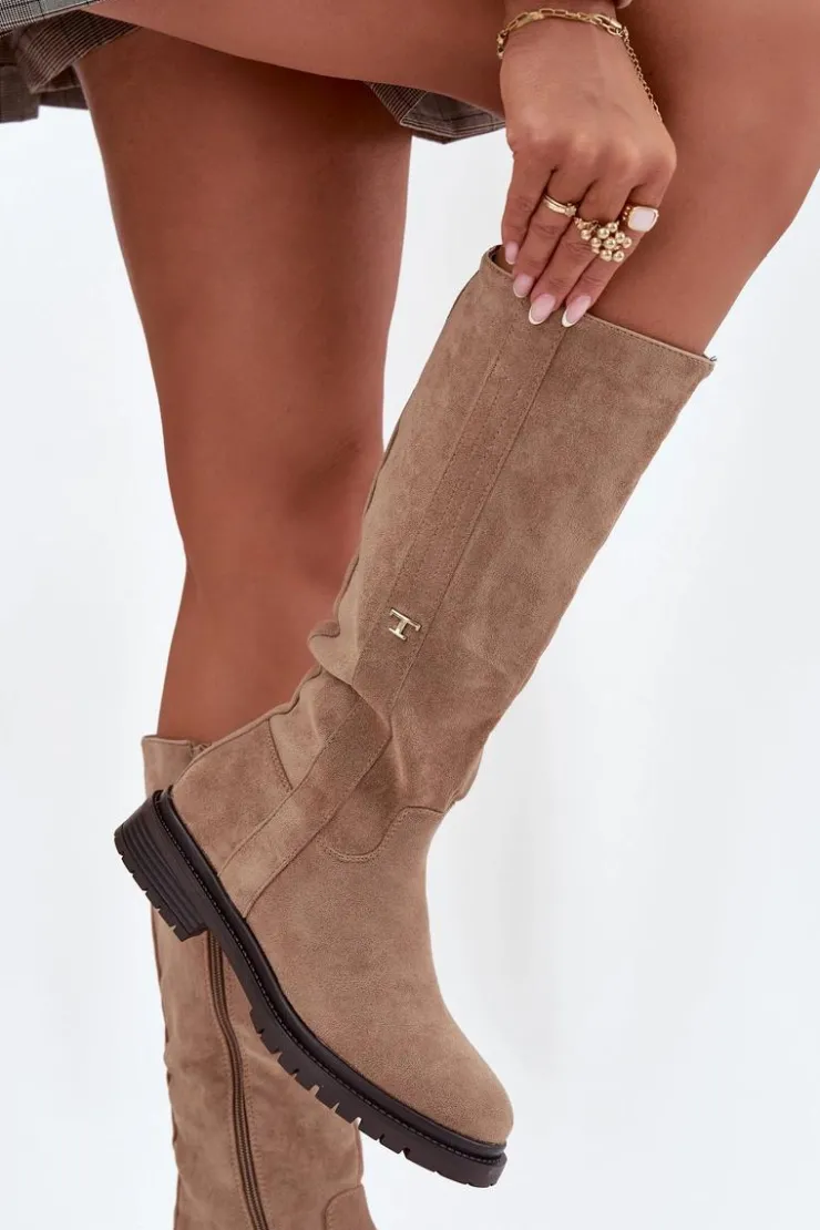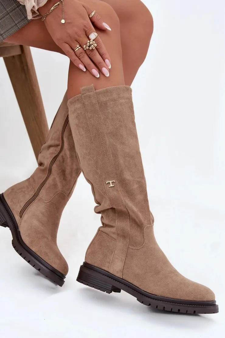 Kozaki damskie na płaskim obcasie to praktyczna i stylowa propozycja na zimowe dni. Model zapinany na zamek ułatwia szybkie zakładanie, a wnętrze ocieplone miękkim kocem obuwniczym gwarantuje ciepło i komfort nawet w najchłodniejsze dni. Delikatny, złoty detal w postaci litery „T” umieszczony po boku cholewki dodaje subtelnego, eleganckiego akcentu, dzięki czemu kozaki doskonale sprawdzą się w codziennych zimowych stylizacjach. Przy wyborze rozmiaru prosimy sugerować się tabelą rozmiarów.
